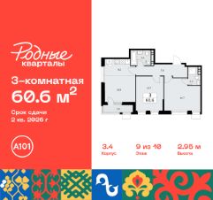 Продается трехкомнатная квартира 521 в новостройке Жилой район "Родные кварталы" по адресу Москва, ТиНАО, Новомосковский АО, Марушкинское С/П, жилой комплекс Родные Кварталы, 3.4, район Внуково, Новомосковский административный округ, Москва. Общая площадь квартиры - 60.60 кв. м., этаж 9 из 10, секция 11. Тип проекта, по которому построен дом - монолит, компания-застройщик - ООО "А101". Стоимость квартиры - 13677420 Р. Срок сдачи - 2 квартал 2026.