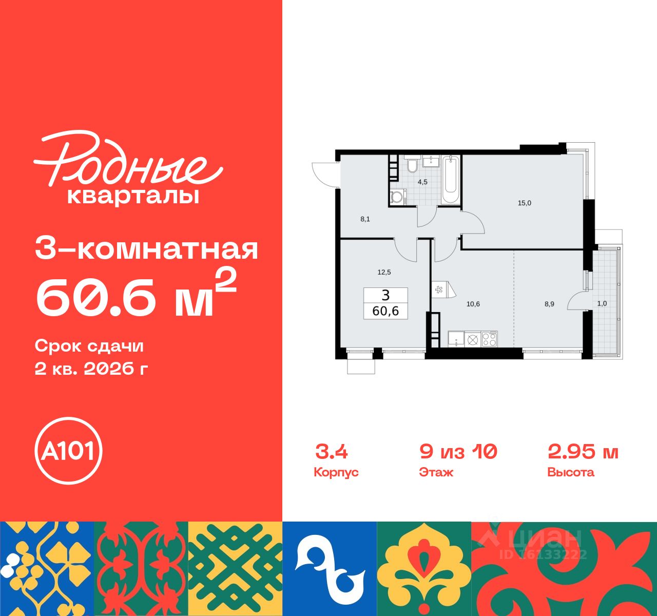 Продается трехкомнатная квартира 526 в новостройке Жилой район "Родные кварталы" по адресу Москва, ТиНАО, Новомосковский АО, Марушкинское С/П, жилой комплекс Родные Кварталы, 3.4, район Внуково, Новомосковский административный округ, Москва. Общая площадь квартиры - 60.60 кв. м., этаж 9 из 10, секция 11. Тип проекта, по которому построен дом - монолит, компания-застройщик - ООО "А101". Стоимость квартиры - 13347150 Р. Срок сдачи - 2 квартал 2026.