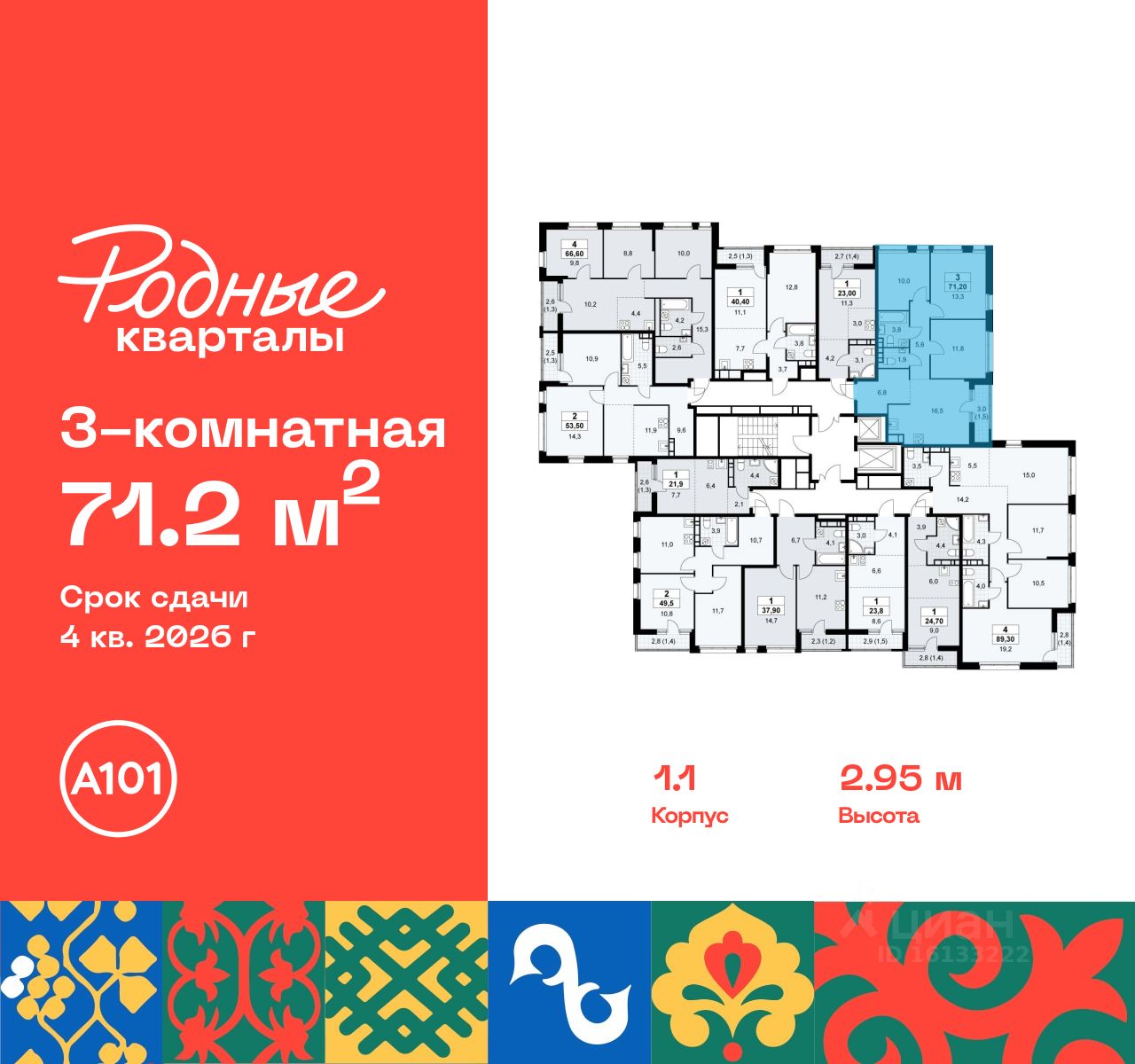 Продается трехкомнатная квартира 99 в новостройке Жилой район "Родные кварталы" по адресу Москва, ТиНАО, Новомосковский АО, Марушкинское С/П, жилой комплекс Родные Кварталы, 1.1, район Внуково, Новомосковский административный округ, Москва. Общая площадь квартиры - 71.20 кв. м., этаж 10 из 10, секция 1. Тип проекта, по которому построен дом - монолит, компания-застройщик - ООО "А101". Стоимость квартиры - 19675408 Р. Срок сдачи - 4 квартал 2026.