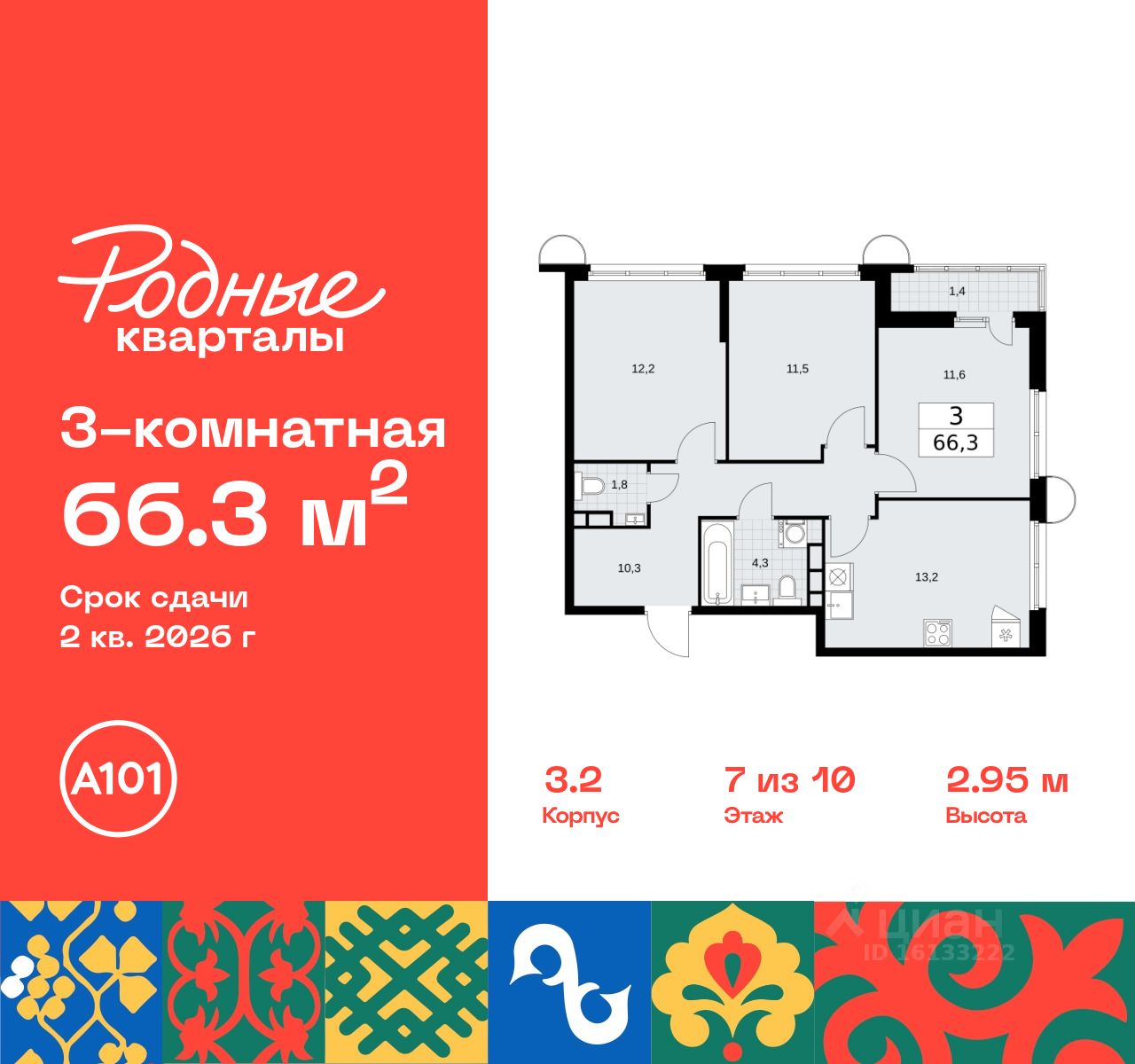 Продается трехкомнатная квартира 263 в новостройке Жилой район "Родные кварталы" по адресу Москва, ТиНАО, Новомосковский АО, Марушкинское С/П, жилой комплекс Родные Кварталы, 3.2, район Внуково, Новомосковский административный округ, Москва. Общая площадь квартиры - 66.30 кв. м., этаж 7 из 10, секция 6. Тип проекта, по которому построен дом - монолит, компания-застройщик - ООО "А101". Стоимость квартиры - 17857905 Р. Срок сдачи - 2 квартал 2026.