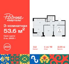 Продается трехкомнатная квартира 200 в новостройке Жилой район "Родные кварталы" по адресу Москва, ТиНАО, Новомосковский АО, Марушкинское С/П, жилой комплекс Родные Кварталы, 3.2, район Внуково, Новомосковский административный округ, Москва. Общая площадь квартиры - 53.60 кв. м., этаж 4 из 10, секция 5. Тип проекта, по которому построен дом - монолит, компания-застройщик - ООО "А101". Стоимость квартиры - 14883112 Р. Срок сдачи - 2 квартал 2026.