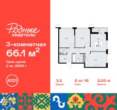 Продается трехкомнатная квартира 268 в новостройке Жилой район "Родные кварталы" по адресу Москва, ТиНАО, Новомосковский АО, Марушкинское С/П, жилой комплекс Родные Кварталы, 3.2, район Внуково, Новомосковский административный округ, Москва. Общая площадь квартиры - 66.10 кв. м., этаж 8 из 10, секция 6. Тип проекта, по которому построен дом - монолит, компания-застройщик - ООО "А101". Стоимость квартиры - 17903185 Р. Срок сдачи - 2 квартал 2026.
