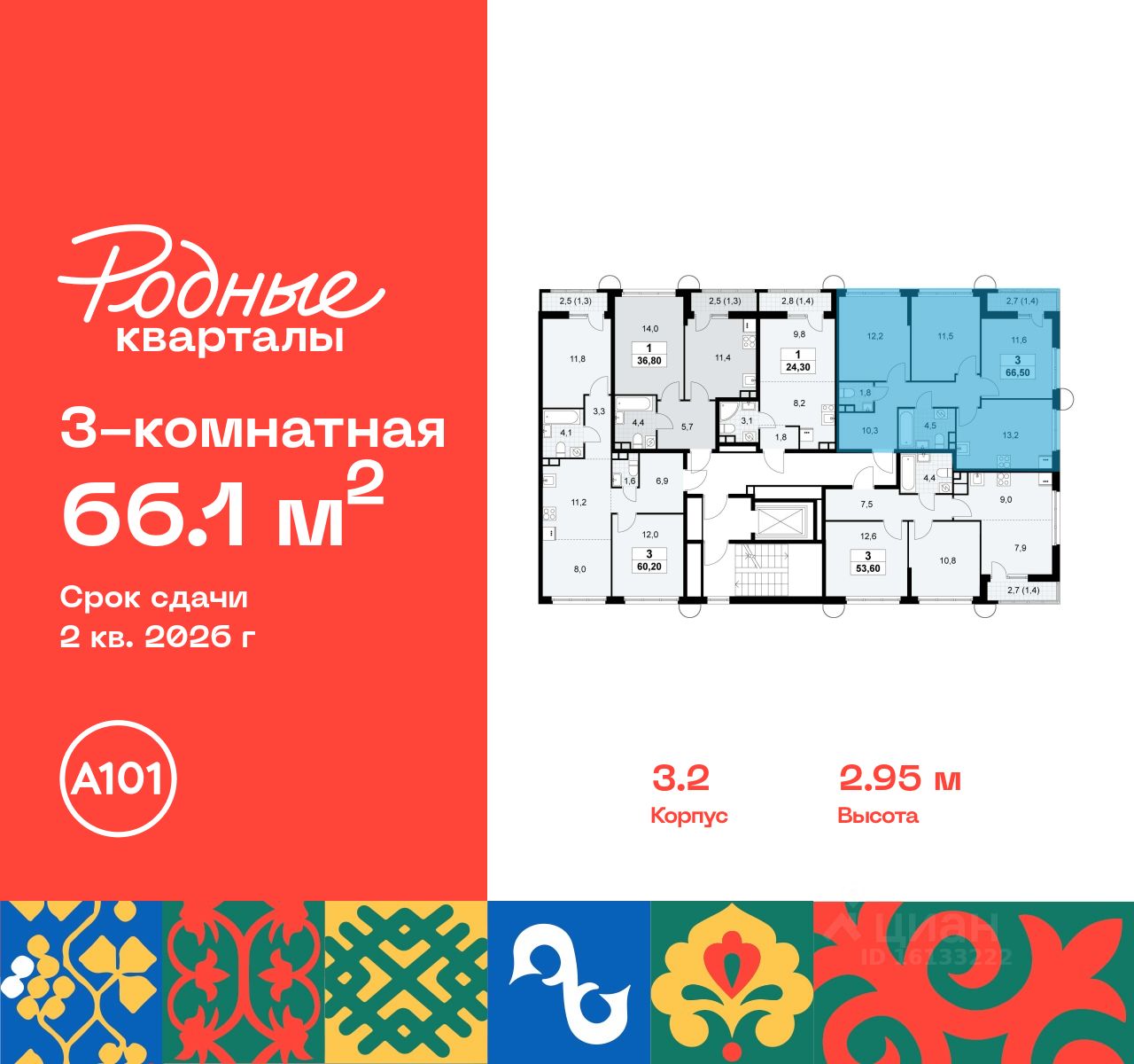 Продается трехкомнатная квартира 268 в новостройке Жилой район "Родные кварталы" по адресу Москва, ТиНАО, Новомосковский АО, Марушкинское С/П, жилой комплекс Родные Кварталы, 3.2, район Внуково, Новомосковский административный округ, Москва. Общая площадь квартиры - 66.10 кв. м., этаж 8 из 10, секция 6. Тип проекта, по которому построен дом - монолит, компания-застройщик - ООО "А101". Стоимость квартиры - 20243786 Р. Срок сдачи - 2 квартал 2026.