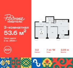 Продается трехкомнатная квартира 264 в новостройке Жилой район "Родные кварталы" по адресу Москва, ТиНАО, Новомосковский АО, Марушкинское С/П, жилой комплекс Родные Кварталы, 3.2, район Внуково, Новомосковский административный округ, Москва. Общая площадь квартиры - 53.60 кв. м., этаж 7 из 10, секция 6. Тип проекта, по которому построен дом - монолит, компания-застройщик - ООО "А101". Стоимость квартиры - 14510056 Р. Срок сдачи - 2 квартал 2026.