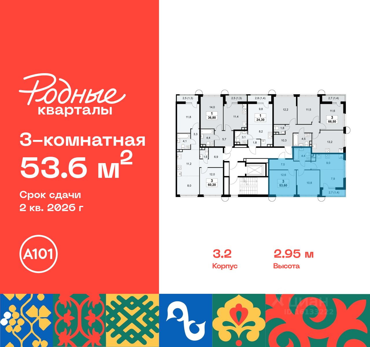 Продается трехкомнатная квартира 264 в новостройке Жилой район "Родные кварталы" по адресу Москва, ТиНАО, Новомосковский АО, Марушкинское С/П, жилой комплекс Родные Кварталы, 3.2, район Внуково, Новомосковский административный округ, Москва. Общая площадь квартиры - 53.60 кв. м., этаж 7 из 10, секция 6. Тип проекта, по которому построен дом - монолит, компания-застройщик - ООО "А101". Стоимость квартиры - 18355320 Р. Срок сдачи - 2 квартал 2026.
