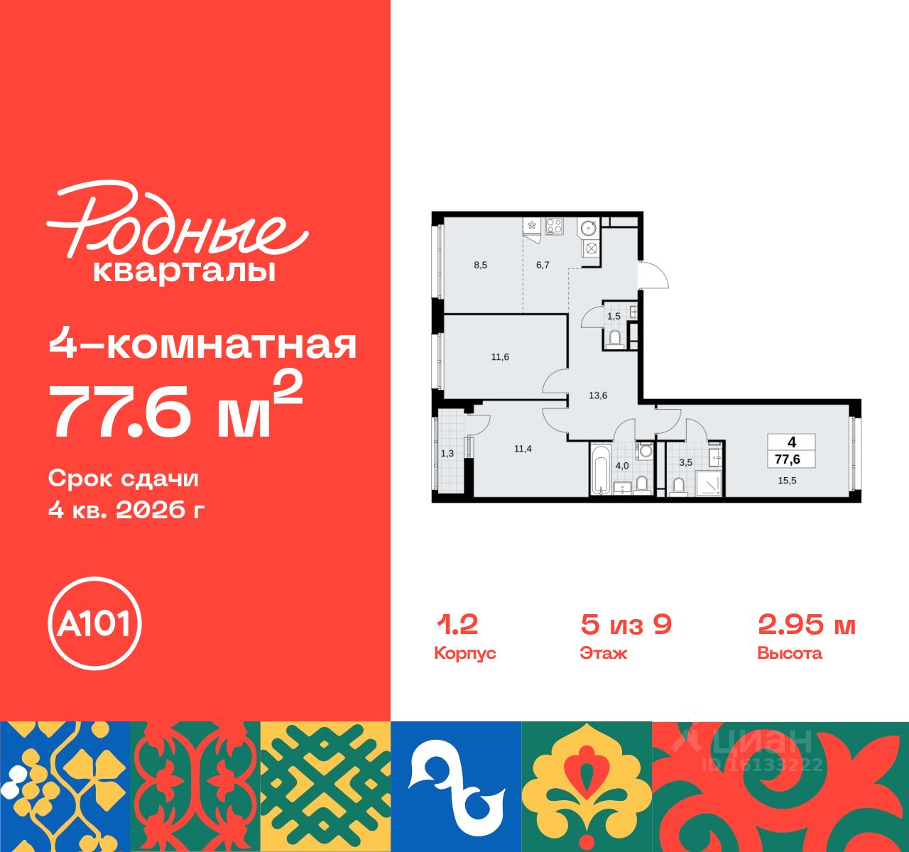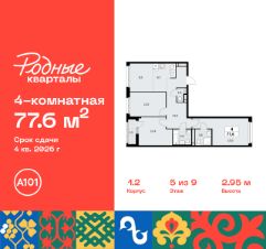 Продается четырехкомнатная квартира 213 в новостройке Жилой район "Родные кварталы" по адресу Москва, ТиНАО, Новомосковский АО, Марушкинское С/П, жилой комплекс Родные Кварталы, 1.2, район Внуково, Новомосковский административный округ, Москва. Общая площадь квартиры - 77.60 кв. м., этаж 5 из 9, секция 4. Тип проекта, по которому построен дом - монолит, компания-застройщик - ООО "А101". Стоимость квартиры - 18302736 Р. Срок сдачи - 4 квартал 2026.