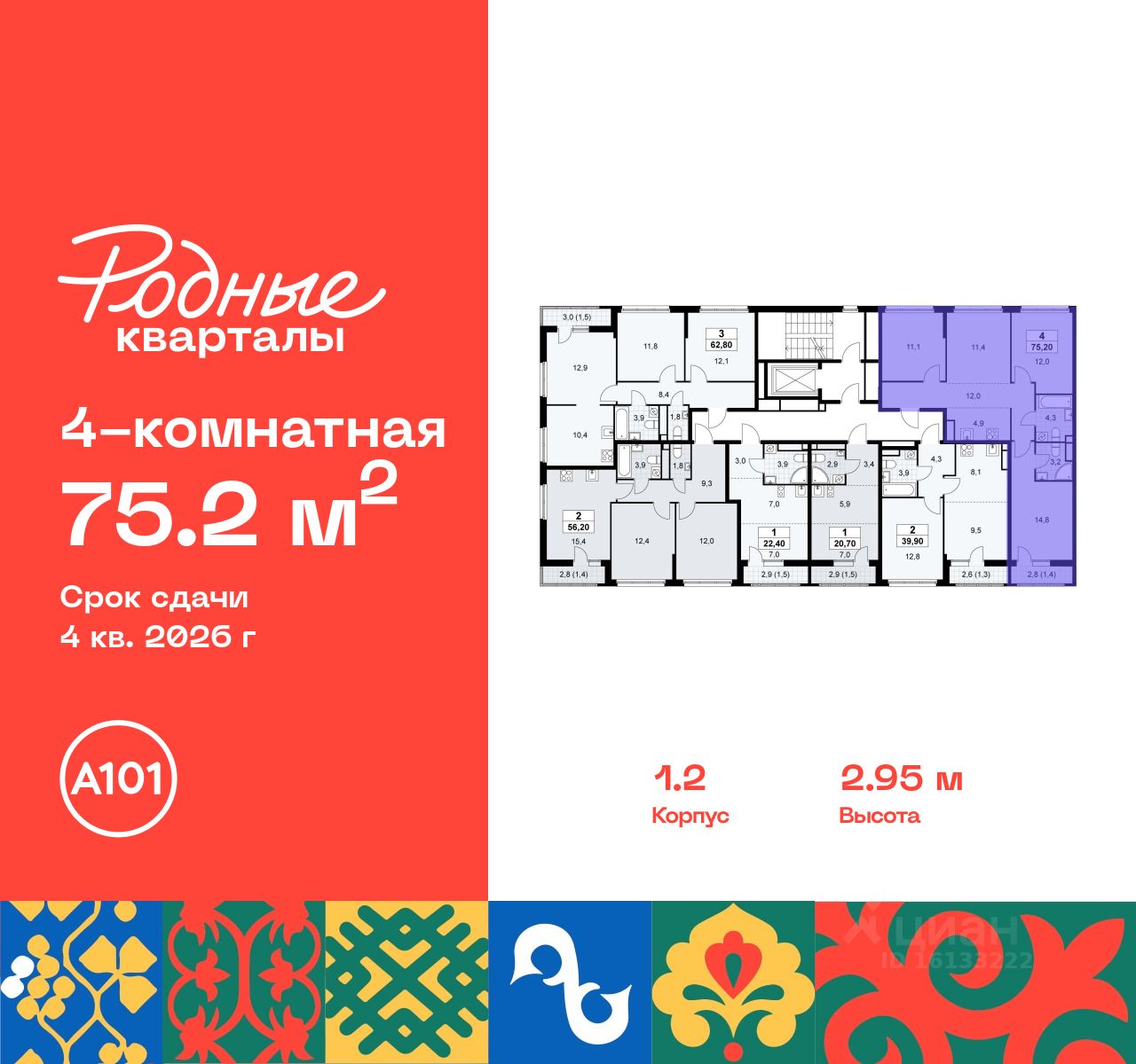 Продается четырехкомнатная квартира 142 в новостройке Жилой район "Родные кварталы" по адресу Москва, ТиНАО, Новомосковский АО, Марушкинское С/П, жилой комплекс Родные Кварталы, 1.2, район Внуково, Новомосковский административный округ, Москва. Общая площадь квартиры - 75.20 кв. м., этаж 9 из 9, секция 2. Тип проекта, по которому построен дом - монолит, компания-застройщик - ООО "А101". Стоимость квартиры - 19213600 Р. Срок сдачи - 4 квартал 2026.