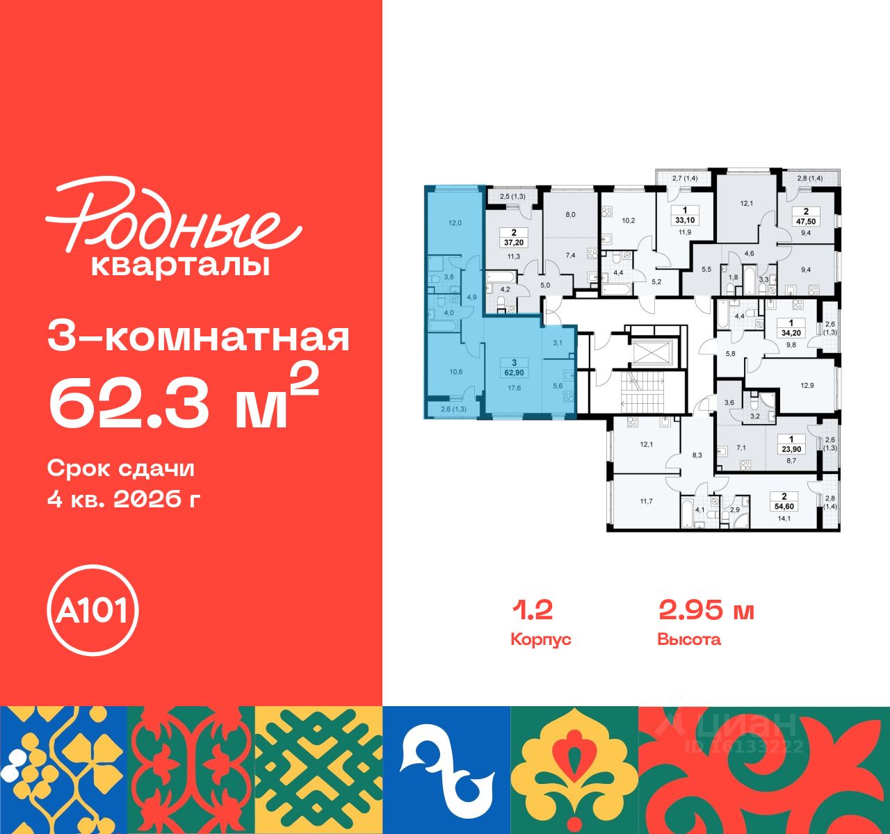 Продается трехкомнатная квартира 334 в новостройке Жилой район "Родные кварталы" по адресу Москва, ТиНАО, Новомосковский АО, Марушкинское С/П, жилой комплекс Родные Кварталы, 1.2, район Внуково, Новомосковский административный округ, Москва. Общая площадь квартиры - 62.30 кв. м., этаж 8 из 9, секция 6. Тип проекта, по которому построен дом - монолит, компания-застройщик - ООО "А101". Стоимость квартиры - 18338628 Р. Срок сдачи - 4 квартал 2026.