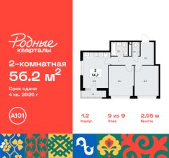 Продается двухкомнатная квартира 146 в новостройке Жилой район "Родные кварталы" по адресу Москва, ТиНАО, Новомосковский АО, Марушкинское С/П, жилой комплекс Родные Кварталы, 1.2, район Внуково, Новомосковский административный округ, Москва. Общая площадь квартиры - 56.20 кв. м., этаж 9 из 9, секция 2. Тип проекта, по которому построен дом - монолит, компания-застройщик - ООО "А101". Стоимость квартиры - 16111978 Р. Срок сдачи - 4 квартал 2026.