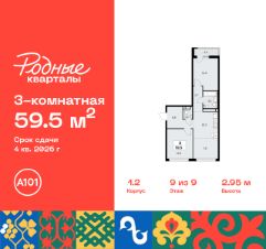 Продается трехкомнатная квартира 291 в новостройке Жилой район "Родные кварталы" по адресу Москва, ТиНАО, Новомосковский АО, Марушкинское С/П, жилой комплекс Родные Кварталы, 1.2, район Внуково, Новомосковский административный округ, Москва. Общая площадь квартиры - 59.50 кв. м., этаж 9 из 9, секция 5. Тип проекта, по которому построен дом - монолит, компания-застройщик - ООО "А101". Стоимость квартиры - 16035250 Р. Срок сдачи - 4 квартал 2026.