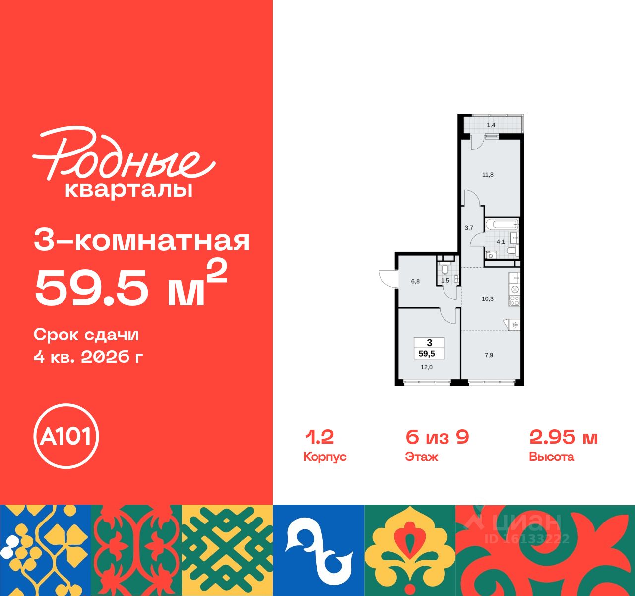 Продается трехкомнатная квартира 276 в новостройке Жилой район "Родные кварталы" по адресу Москва, ТиНАО, Новомосковский АО, Марушкинское С/П, жилой комплекс Родные Кварталы, 1.2, район Внуково, Новомосковский административный округ, Москва. Общая площадь квартиры - 59.50 кв. м., этаж 6 из 9, секция 5. Тип проекта, по которому построен дом - монолит, компания-застройщик - ООО "А101". Стоимость квартиры - 15900780 Р. Срок сдачи - 4 квартал 2026.