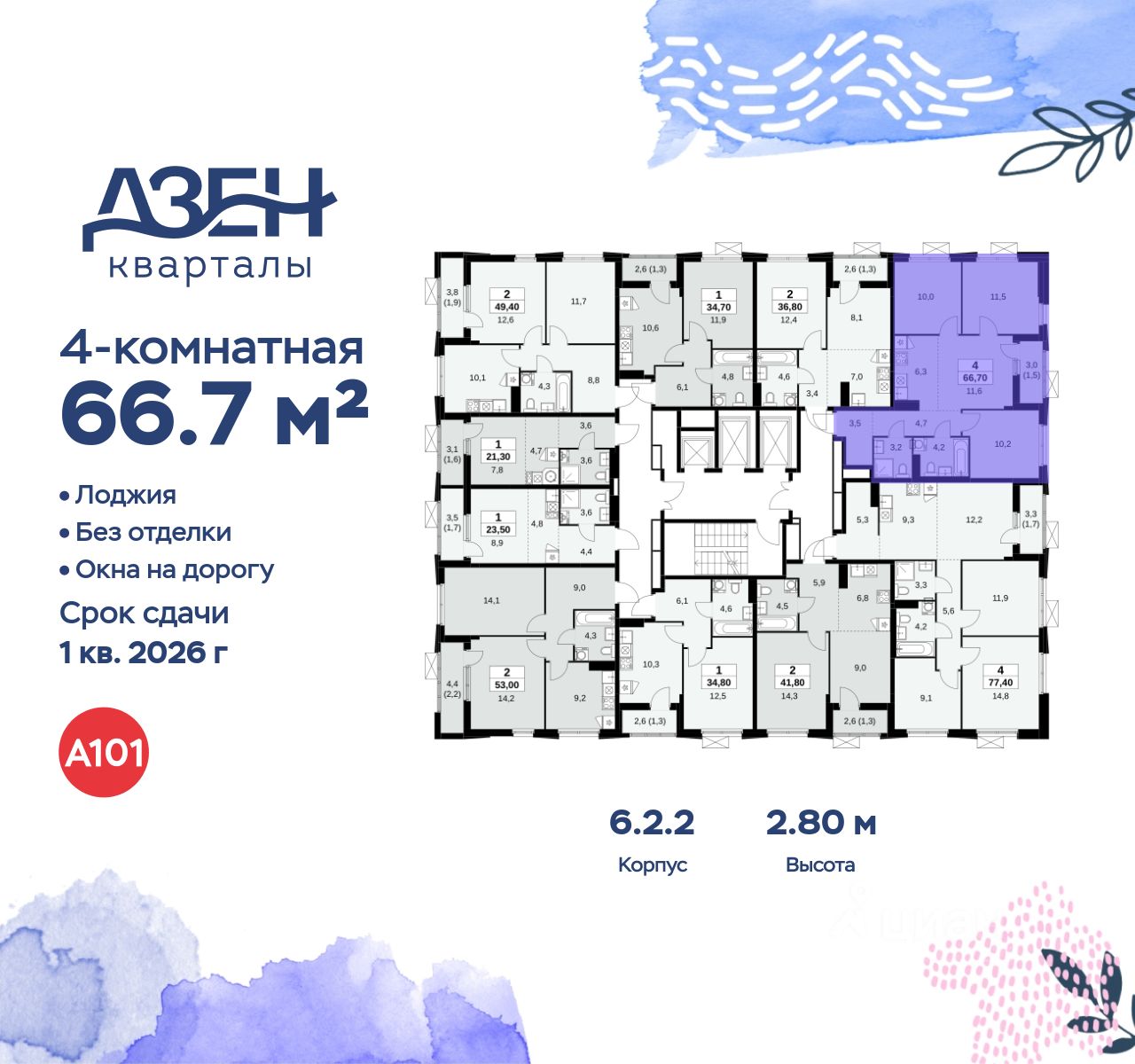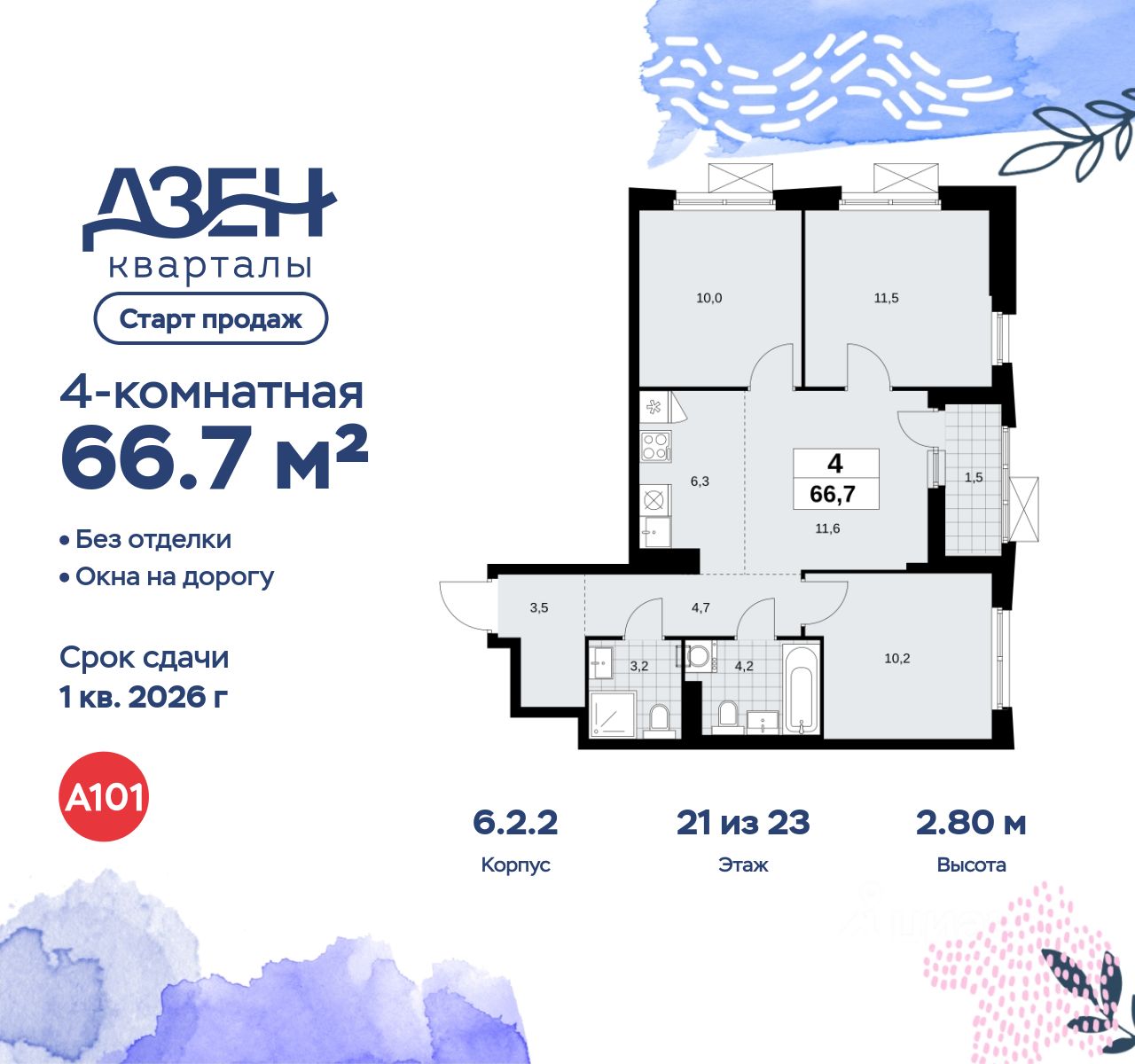 Продается четырехкомнатная квартира 509 в новостройке ЖК "Дзен-кварталы" по адресу Москва, ТиНАО, Новомосковский АО, Сосенское С/П, жилой комплекс Дзен-кварталы, 6.2.2. Общая площадь квартиры - 66.70 кв. м., этаж 21 из 23, секция 7. Тип проекта, по которому построен дом - монолит, компания-застройщик - ООО "А101". Стоимость квартиры - 24439547 Р. Срок сдачи - 1 квартал 2026.