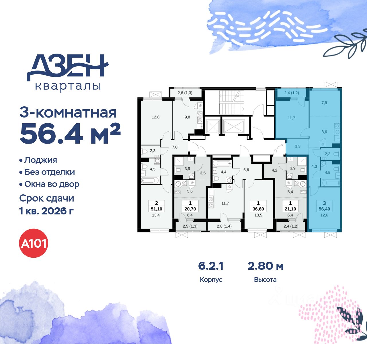Продается трехкомнатная квартира 137 в новостройке ЖК "Дзен-кварталы" по адресу Москва, ТиНАО, Новомосковский АО, Сосенское С/П, жилой комплекс Дзен-кварталы, 6.2.1, район Коммунарка, Новомосковский административный округ, Москва. Общая площадь квартиры - 56.40 кв. м., этаж 11 из 11, секция 3. Тип проекта, по которому построен дом - монолит, компания-застройщик - ООО "А101". Стоимость квартиры - 23757372 Р. Срок сдачи - 1 квартал 2026.