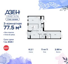 Продается трехкомнатная квартира 206 в новостройке ЖК "Дзен-кварталы" по адресу Москва, ТиНАО, Новомосковский АО, Сосенское С/П, жилой комплекс Дзен-кварталы, 6.2.1, район Коммунарка, Новомосковский административный округ, Москва. Общая площадь квартиры - 77.50 кв. м., этаж 11 из 11, секция 4. Тип проекта, по которому построен дом - монолит, компания-застройщик - ООО "А101". Стоимость квартиры - 22147175 Р. Срок сдачи - 1 квартал 2026.
