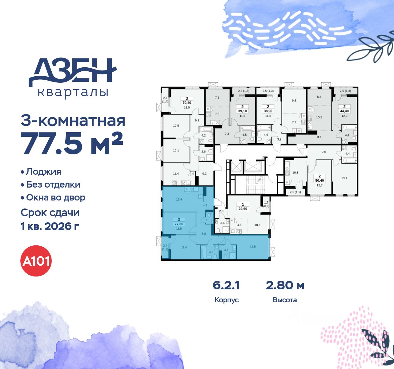 Продается трехкомнатная квартира 206 в новостройке ЖК "Дзен-кварталы" по адресу Москва, ТиНАО, Новомосковский АО, Сосенское С/П, жилой комплекс Дзен-кварталы, 6.2.1, район Коммунарка, Новомосковский административный округ, Москва. Общая площадь квартиры - 77.50 кв. м., этаж 11 из 11, секция 4. Тип проекта, по которому построен дом - монолит, компания-застройщик - ООО "А101". Стоимость квартиры - 24704675 Р. Срок сдачи - 1 квартал 2026.