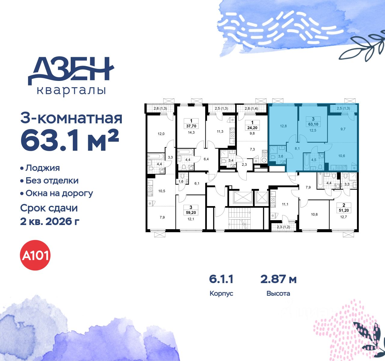 Продается трехкомнатная квартира 160 в новостройке ЖК "Дзен-кварталы" по адресу Москва, ТиНАО, Новомосковский АО, Сосенское С/П, жилой комплекс Дзен-кварталы, 6.1.1, район Коммунарка, Новомосковский административный округ, Москва. Общая площадь квартиры - 63.10 кв. м., этаж 6 из 11, секция 4. Тип проекта, по которому построен дом - монолит, компания-застройщик - ООО "А101". Стоимость квартиры - 22764587 Р. Срок сдачи - 2 квартал 2026.