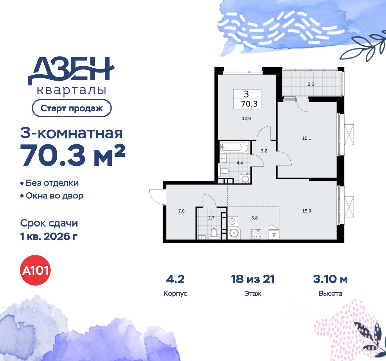 Продается трехкомнатная квартира 246 в новостройке ЖК "Дзен-кварталы" по адресу Москва, ТиНАО, Новомосковский АО, Сосенское С/П, жилой комплекс Дзен-кварталы, 4.2, район Коммунарка, Новомосковский административный округ, Москва. Общая площадь квартиры - 70.30 кв. м., этаж 18 из 21, секция 4. Тип проекта, по которому построен дом - монолит, компания-застройщик - ООО "А101". Стоимость квартиры - 21579991 Р. Срок сдачи - 1 квартал 2026.