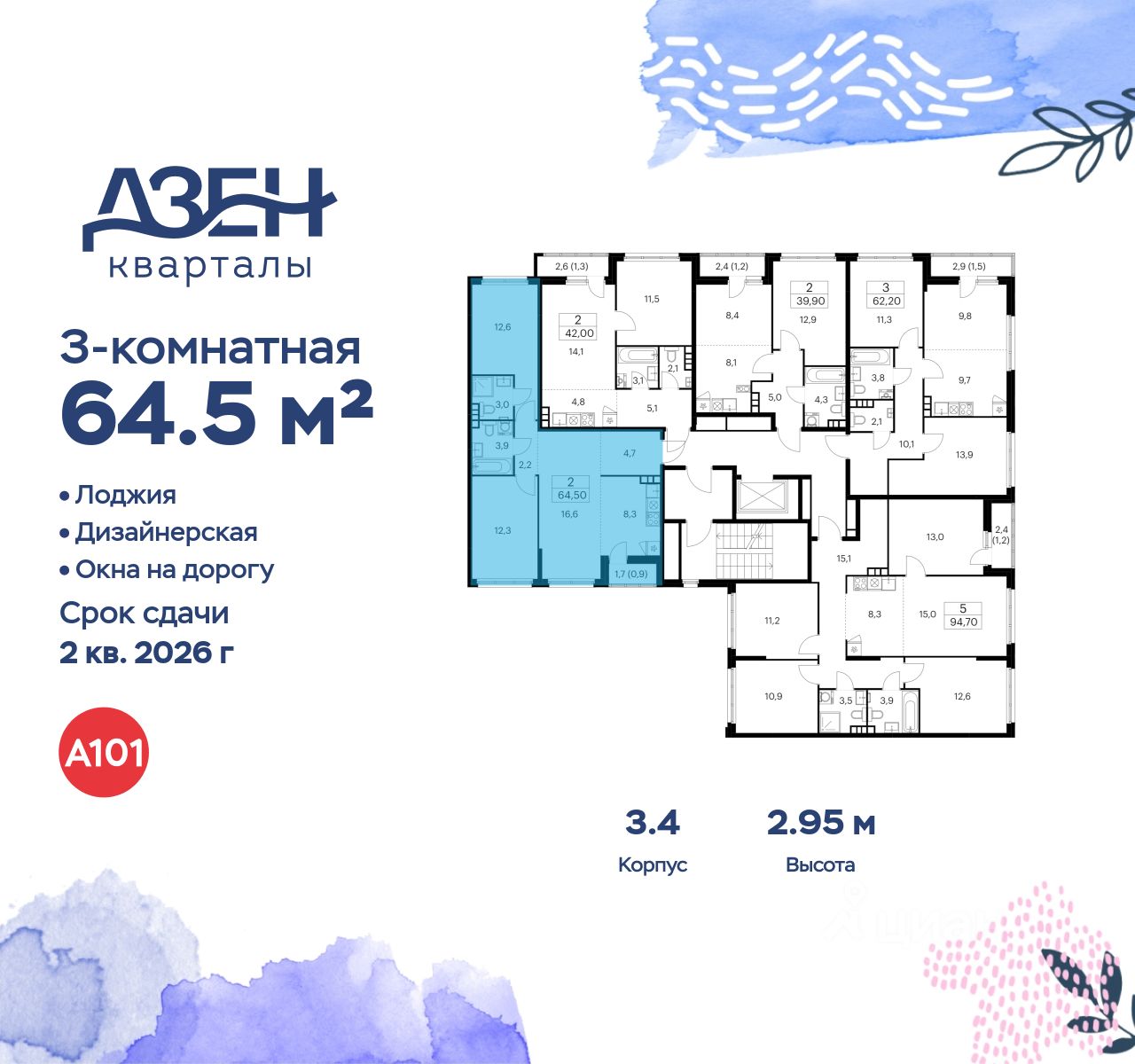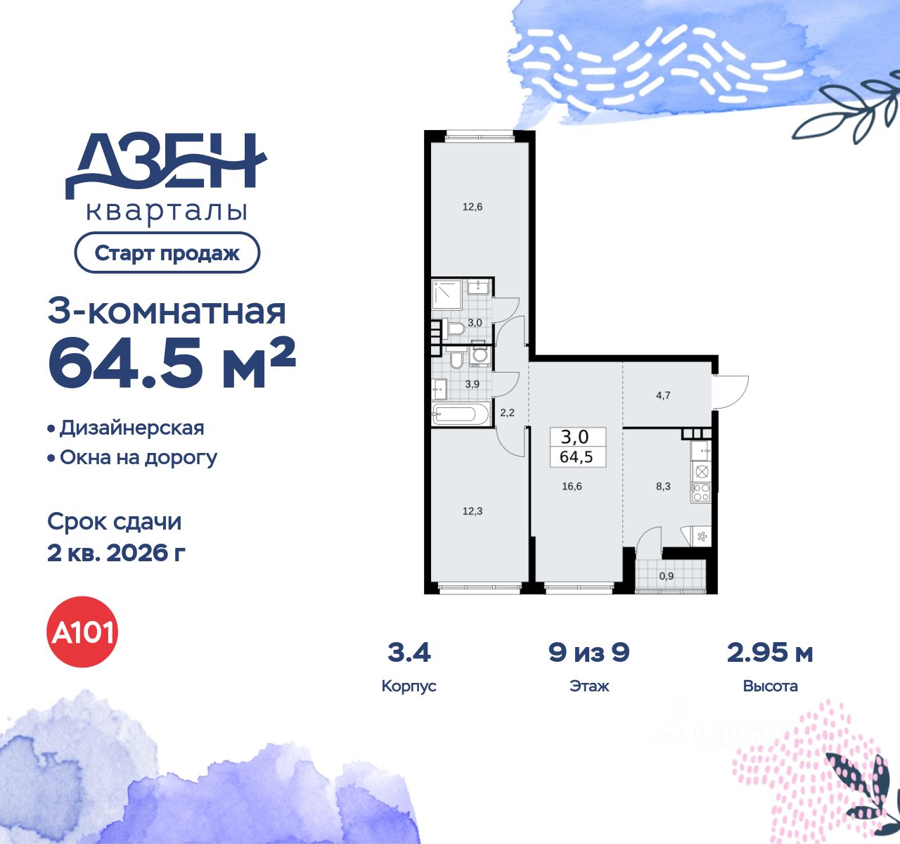 Продается трехкомнатная квартира 870 в новостройке ЖК "Дзен-кварталы" по адресу Москва, ТиНАО, Новомосковский АО, Сосенское С/П, жилой комплекс Дзен-кварталы, 3.4, район Коммунарка, Новомосковский административный округ, Москва. Общая площадь квартиры - 64.50 кв. м., этаж 9 из 9, секция 11. Тип проекта, по которому построен дом - монолит, компания-застройщик - ООО "А101". Стоимость квартиры - 28109745 Р. Срок сдачи - 2 квартал 2026.
