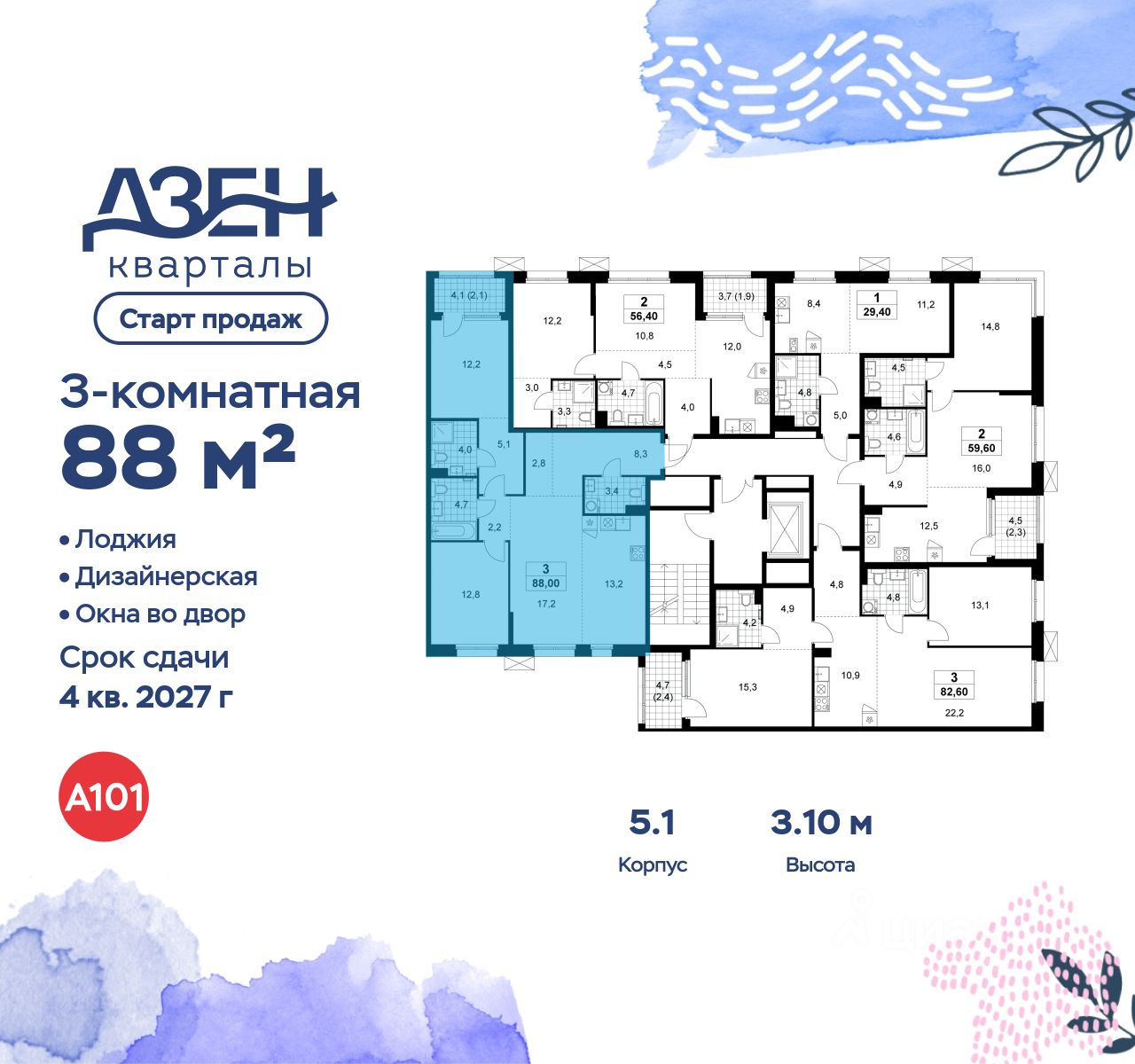 Продается трехкомнатная квартира 50 в новостройке ЖК "Дзен-кварталы" по адресу Москва, ТиНАО, Новомосковский АО, Сосенское С/П, Москва, Новомосковский административный округ, район Коммунарка, ЖК Дзен-кварталы. Общая площадь квартиры - 88.00 кв. м., этаж 3 из 8, секция 2. Тип проекта, по которому построен дом - монолит, компания-застройщик - ООО "А101". Стоимость квартиры - 29583840 Р. Срок сдачи - 4 квартал 2027.