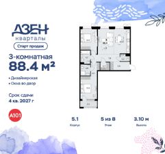 Продается трехкомнатная квартира 95 в новостройке ЖК "Дзен-кварталы" по адресу Москва, ТиНАО, Новомосковский АО, Сосенское С/П, Москва, Новомосковский административный округ, район Коммунарка, ЖК Дзен-кварталы. Общая площадь квартиры - 88.40 кв. м., этаж 5 из 8, секция 3. Тип проекта, по которому построен дом - монолит, компания-застройщик - ООО "А101". Стоимость квартиры - 33594652 Р. Срок сдачи - 4 квартал 2027.