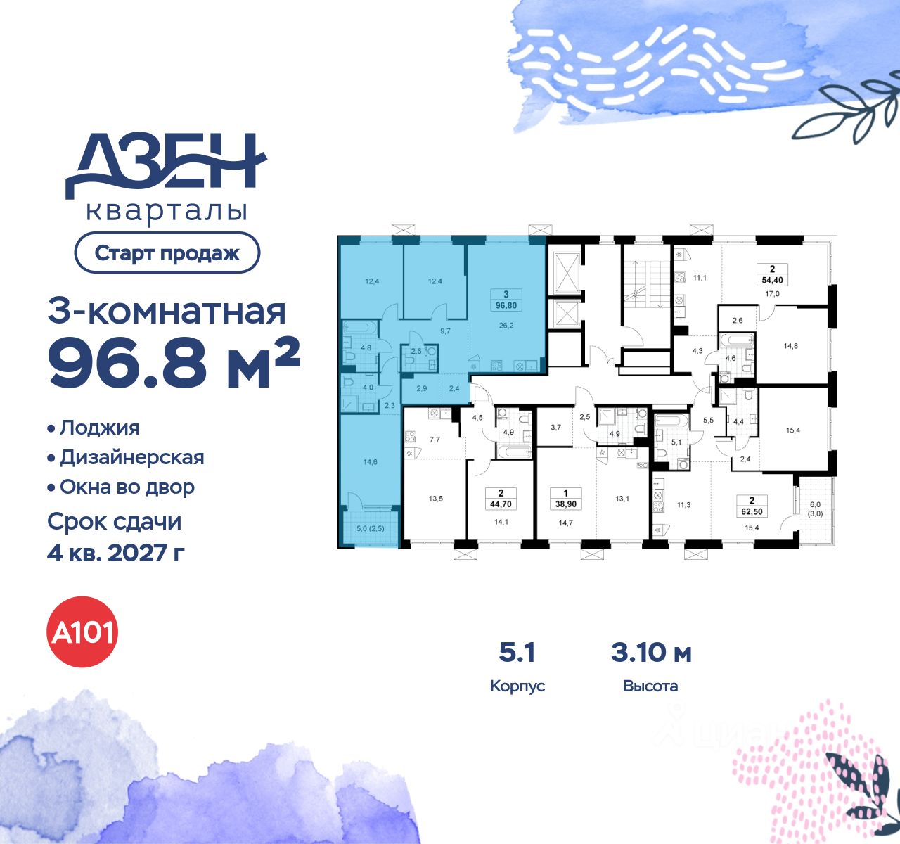 Продается трехкомнатная квартира 122 в новостройке ЖК "Дзен-кварталы" по адресу Москва, ТиНАО, Новомосковский АО, Сосенское С/П, Москва, Новомосковский административный округ, район Коммунарка, ЖК Дзен-кварталы. Общая площадь квартиры - 96.80 кв. м., этаж 4 из 12, секция 4. Тип проекта, по которому построен дом - монолит, компания-застройщик - ООО "А101". Стоимость квартиры - 34653432 Р. Срок сдачи - 4 квартал 2027.