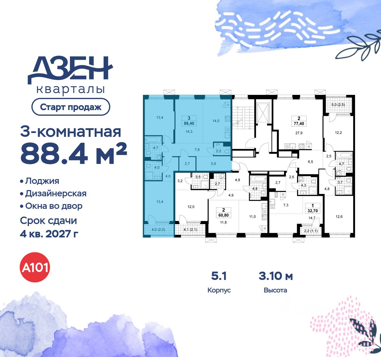 Продается трехкомнатная квартира 103 в новостройке ЖК "Дзен-кварталы" по адресу Москва, ТиНАО, Новомосковский АО, Сосенское С/П, Москва, Новомосковский административный округ, район Коммунарка, ЖК Дзен-кварталы. Общая площадь квартиры - 88.40 кв. м., этаж 7 из 8, секция 3. Тип проекта, по которому построен дом - монолит, компания-застройщик - ООО "А101". Стоимость квартиры - 33769684 Р. Срок сдачи - 4 квартал 2027.