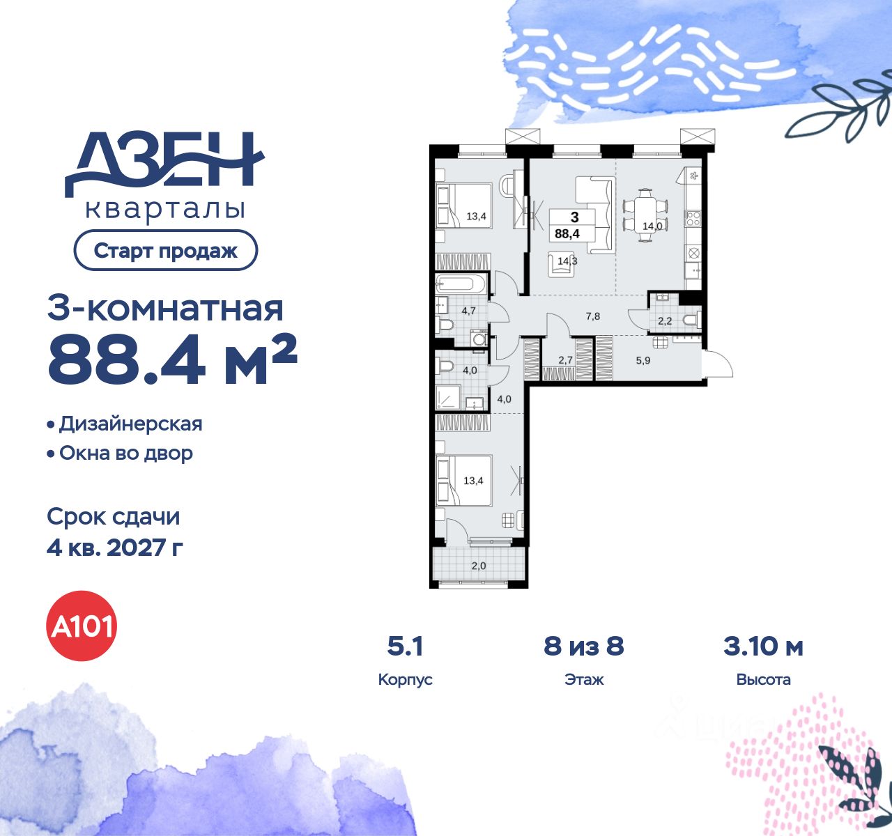 Продается трехкомнатная квартира 107 в новостройке ЖК "Дзен-кварталы" по адресу Москва, ТиНАО, Новомосковский АО, Сосенское С/П, Москва, Новомосковский административный округ, район Коммунарка, ЖК Дзен-кварталы. Общая площадь квартиры - 88.40 кв. м., этаж 8 из 8, секция 3. Тип проекта, по которому построен дом - монолит, компания-застройщик - ООО "А101". Стоимость квартиры - 33872228 Р. Срок сдачи - 4 квартал 2027.