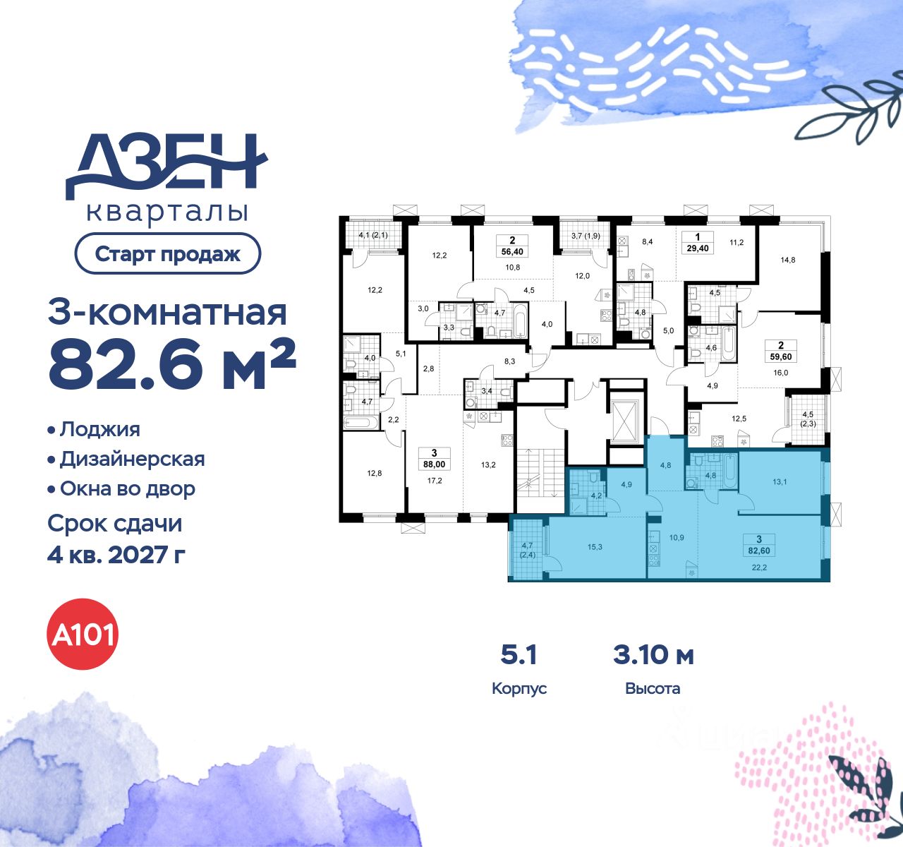 Продается трехкомнатная квартира 64 в новостройке ЖК "Дзен-кварталы" по адресу Москва, ТиНАО, Новомосковский АО, Сосенское С/П, Москва, Новомосковский административный округ, район Коммунарка, ЖК Дзен-кварталы. Общая площадь квартиры - 82.60 кв. м., этаж 5 из 8, секция 2. Тип проекта, по которому построен дом - монолит, компания-застройщик - ООО "А101". Стоимость квартиры - 30819712 Р. Срок сдачи - 4 квартал 2027.