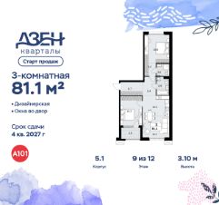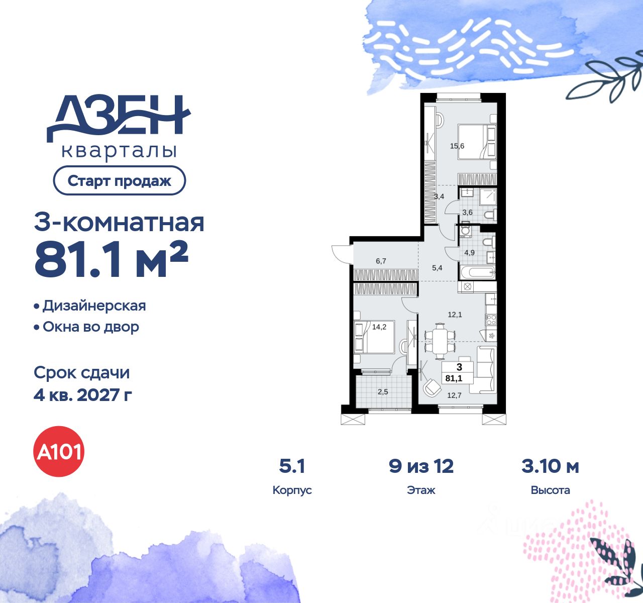 Продается трехкомнатная квартира 32 в новостройке ЖК "Дзен-кварталы" по адресу Москва, ТиНАО, Новомосковский АО, Сосенское С/П, Москва, Новомосковский административный округ, район Коммунарка, ЖК Дзен-кварталы. Общая площадь квартиры - 81.10 кв. м., этаж 9 из 12, секция 1. Тип проекта, по которому построен дом - монолит, компания-застройщик - ООО "А101". Стоимость квартиры - 29198433 Р. Срок сдачи - 4 квартал 2027.