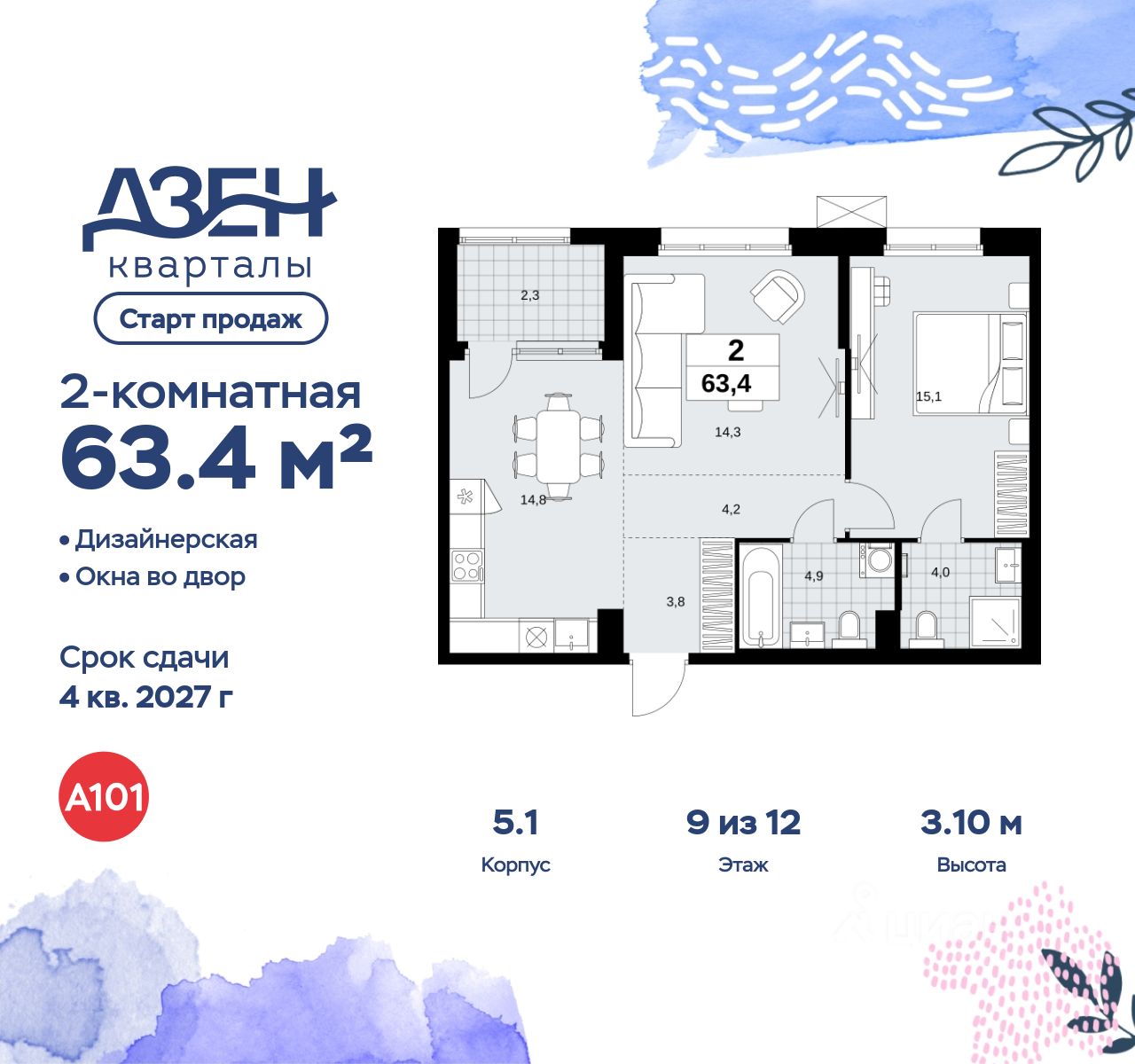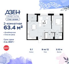 Продается двухкомнатная квартира 31 в новостройке ЖК "Дзен-кварталы" по адресу Москва, ТиНАО, Новомосковский АО, Сосенское С/П, ул. Александры Монаховой, корп. 5.1. Общая площадь квартиры - 63.40 кв. м., этаж 9 из 12, секция 1. Тип проекта, по которому построен дом - монолит, компания-застройщик - ООО "А101". Стоимость квартиры - 22338356 Р. Срок сдачи - 4 квартал 2027.