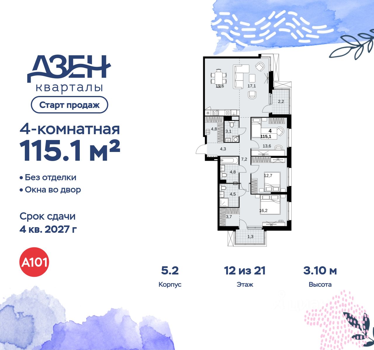 Продается четырехкомнатная квартира 226 в новостройке ЖК "Дзен-кварталы" по адресу Москва, ТиНАО, Новомосковский АО, Сосенское С/П, ул. Александры Монаховой, корп. 5.2. Общая площадь квартиры - 115.10 кв. м., этаж 12 из 21, секция 5. Тип проекта, по которому построен дом - монолит, компания-застройщик - ООО "А101". Стоимость квартиры - 31204761 Р. Срок сдачи - 4 квартал 2027.