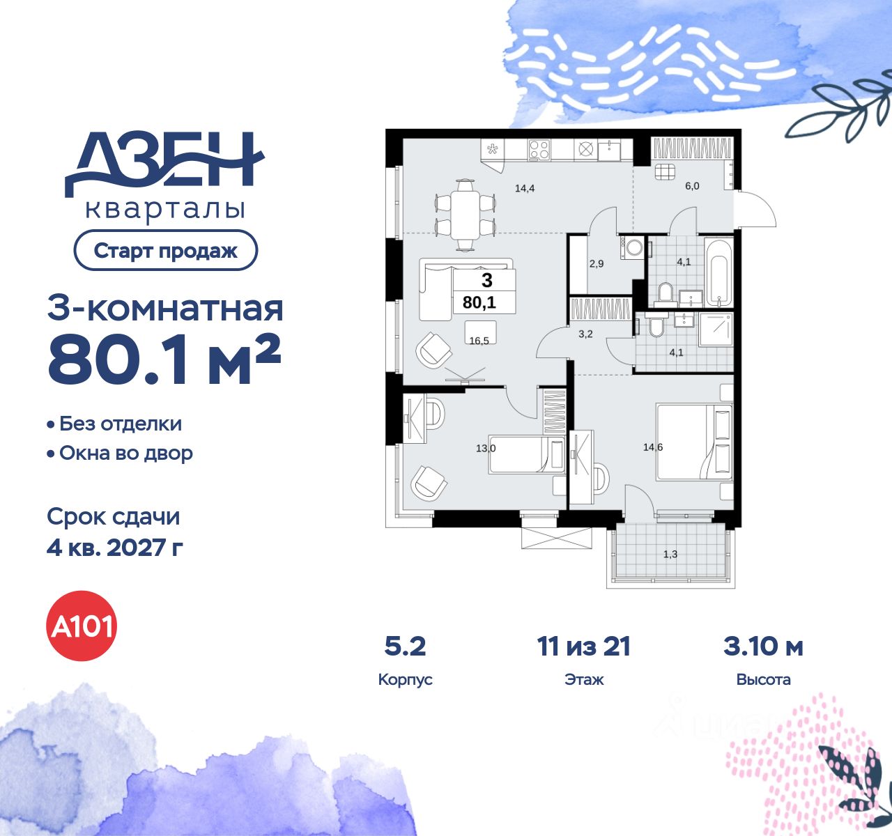 Продается трехкомнатная квартира 222 в новостройке ЖК "Дзен-кварталы" по адресу Москва, ТиНАО, Новомосковский АО, Сосенское С/П, ул. Александры Монаховой, корп. 5.2. Общая площадь квартиры - 80.10 кв. м., этаж 11 из 21, секция 5. Тип проекта, по которому построен дом - монолит, компания-застройщик - ООО "А101". Стоимость квартиры - 20659392 Р. Срок сдачи - 4 квартал 2027.