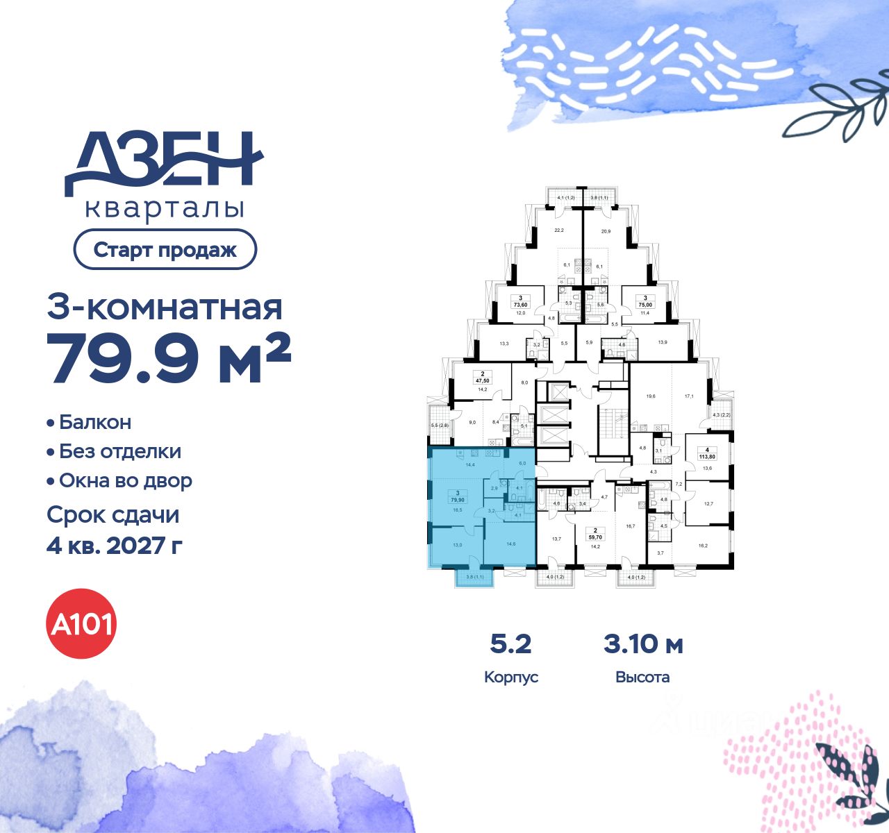 Продается трехкомнатная квартира 210 в новостройке ЖК "Дзен-кварталы" по адресу Москва, ТиНАО, Новомосковский АО, Сосенское С/П, ул. Александры Монаховой, корп. 5.2. Общая площадь квартиры - 79.90 кв. м., этаж 9 из 21, секция 5. Тип проекта, по которому построен дом - монолит, компания-застройщик - ООО "А101". Стоимость квартиры - 26635464 Р. Срок сдачи - 4 квартал 2027.