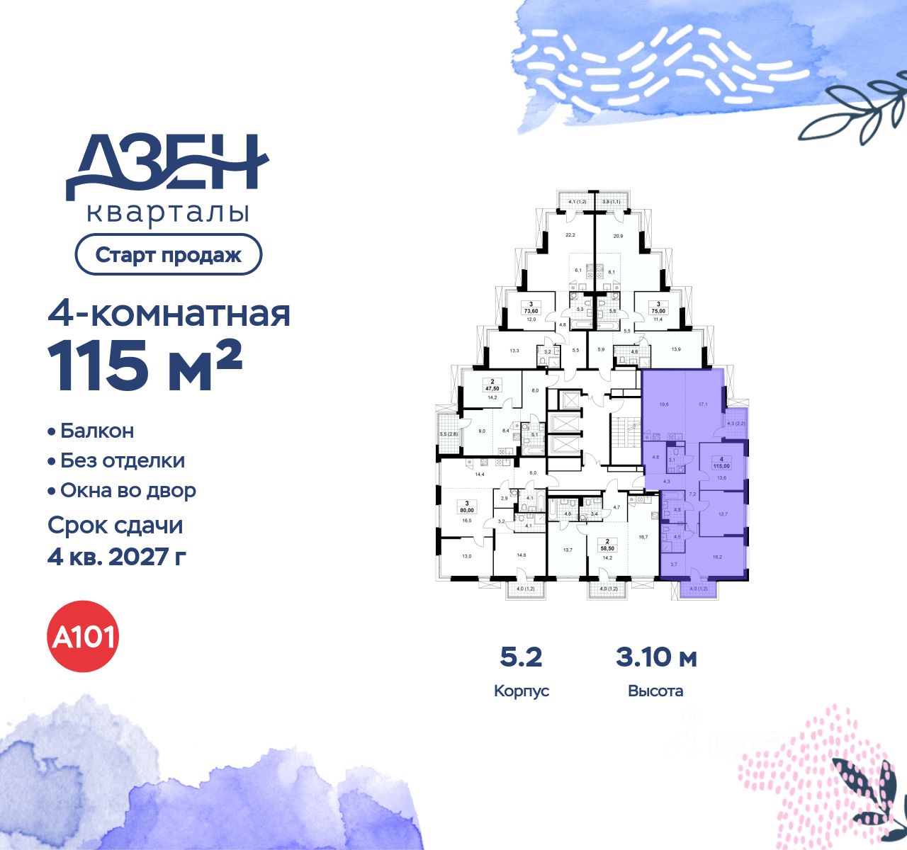 Продается четырехкомнатная квартира 232 в новостройке ЖК "Дзен-кварталы" по адресу Москва, ТиНАО, Новомосковский АО, Сосенское С/П, ул. Александры Монаховой, корп. 5.2. Общая площадь квартиры - 115.00 кв. м., этаж 13 из 21, секция 5. Тип проекта, по которому построен дом - монолит, компания-застройщик - ООО "А101". Стоимость квартиры - 37729200 Р. Срок сдачи - 4 квартал 2027.
