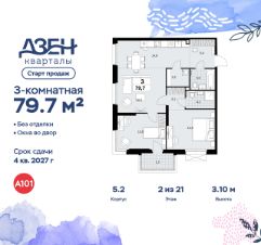 Продается трехкомнатная квартира 168 в новостройке ЖК "Дзен-кварталы" по адресу Москва, ТиНАО, Новомосковский АО, Сосенское С/П, ул. Александры Монаховой, корп. 5.2. Общая площадь квартиры - 79.70 кв. м., этаж 2 из 21, секция 5. Тип проекта, по которому построен дом - монолит, компания-застройщик - ООО "А101". Стоимость квартиры - 19921812 Р. Срок сдачи - 4 квартал 2027.
