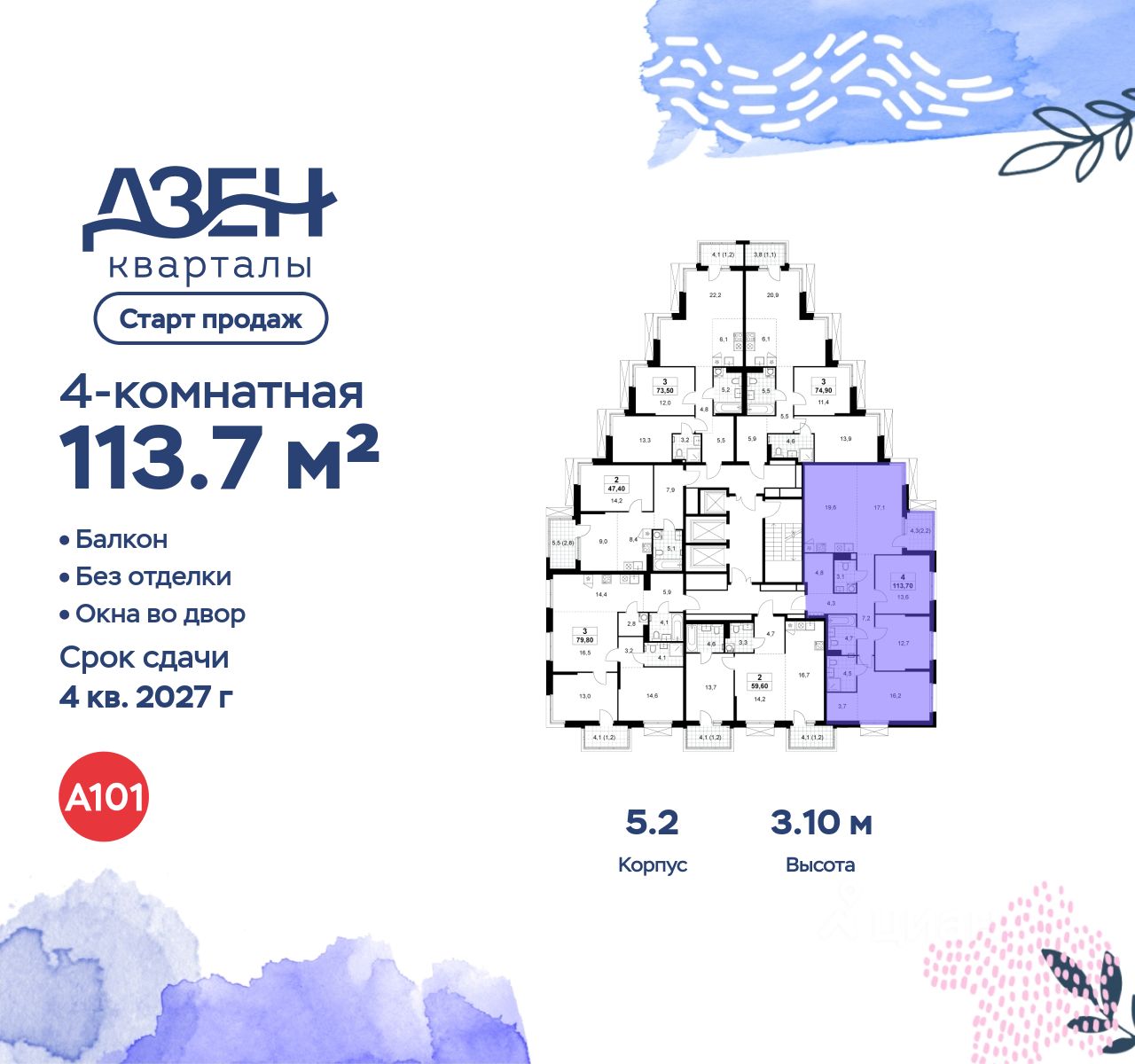 Продается четырехкомнатная квартира 250 в новостройке ЖК "Дзен-кварталы" по адресу Москва, ТиНАО, Новомосковский АО, Сосенское С/П, ул. Александры Монаховой, корп. 5.2. Общая площадь квартиры - 113.70 кв. м., этаж 16 из 21, секция 5. Тип проекта, по которому построен дом - монолит, компания-застройщик - ООО "А101". Стоимость квартиры - 39696081 Р. Срок сдачи - 4 квартал 2027.