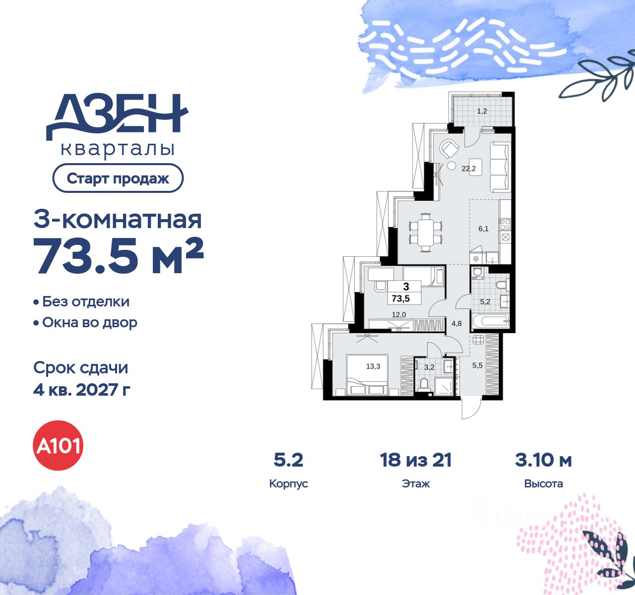 Продается трехкомнатная квартира 260 в новостройке ЖК "Дзен-кварталы" по адресу Москва, ТиНАО, Новомосковский АО, Сосенское С/П, ул. Александры Монаховой, корп. 5.2. Общая площадь квартиры - 73.50 кв. м., этаж 18 из 21, секция 5. Тип проекта, по которому построен дом - монолит, компания-застройщик - ООО "А101". Стоимость квартиры - 27034035 Р. Срок сдачи - 4 квартал 2027.