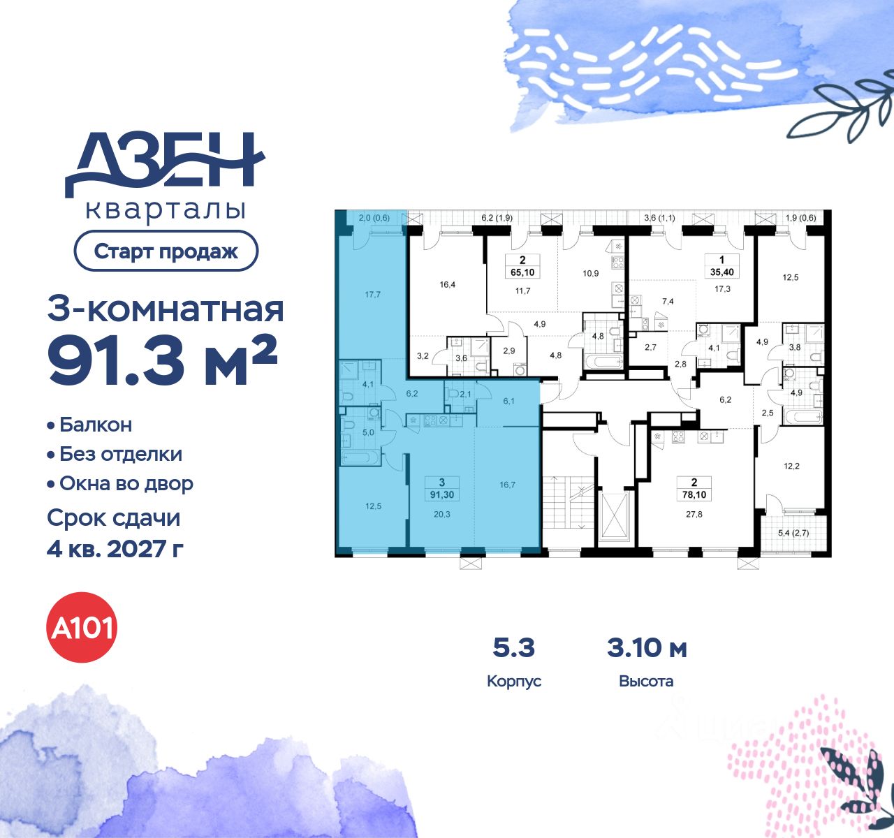 Продается трехкомнатная квартира 300 в новостройке ЖК "Дзен-кварталы" по адресу Москва, ТиНАО, Новомосковский АО, Сосенское С/П, Москва, Новомосковский административный округ, район Коммунарка, ЖК Дзен-кварталы. Общая площадь квартиры - 91.30 кв. м., этаж 2 из 8, секция 7. Тип проекта, по которому построен дом - монолит, компания-застройщик - ООО "А101". Стоимость квартиры - 28139573 Р. Срок сдачи - 4 квартал 2027.