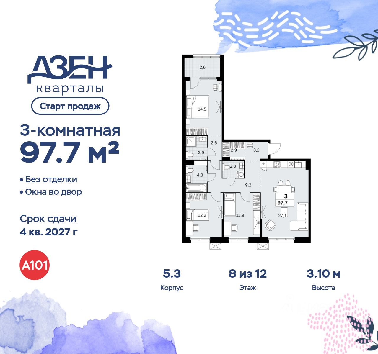 Продается трехкомнатная квартира 358 в новостройке ЖК "Дзен-кварталы" по адресу Москва, ТиНАО, Новомосковский АО, Сосенское С/П, ул. Александры Монаховой, корп. 5.3. Общая площадь квартиры - 97.70 кв. м., этаж 8 из 12, секция 8. Тип проекта, по которому построен дом - монолит, компания-застройщик - ООО "А101". Стоимость квартиры - 24635055 Р. Срок сдачи - 4 квартал 2027.