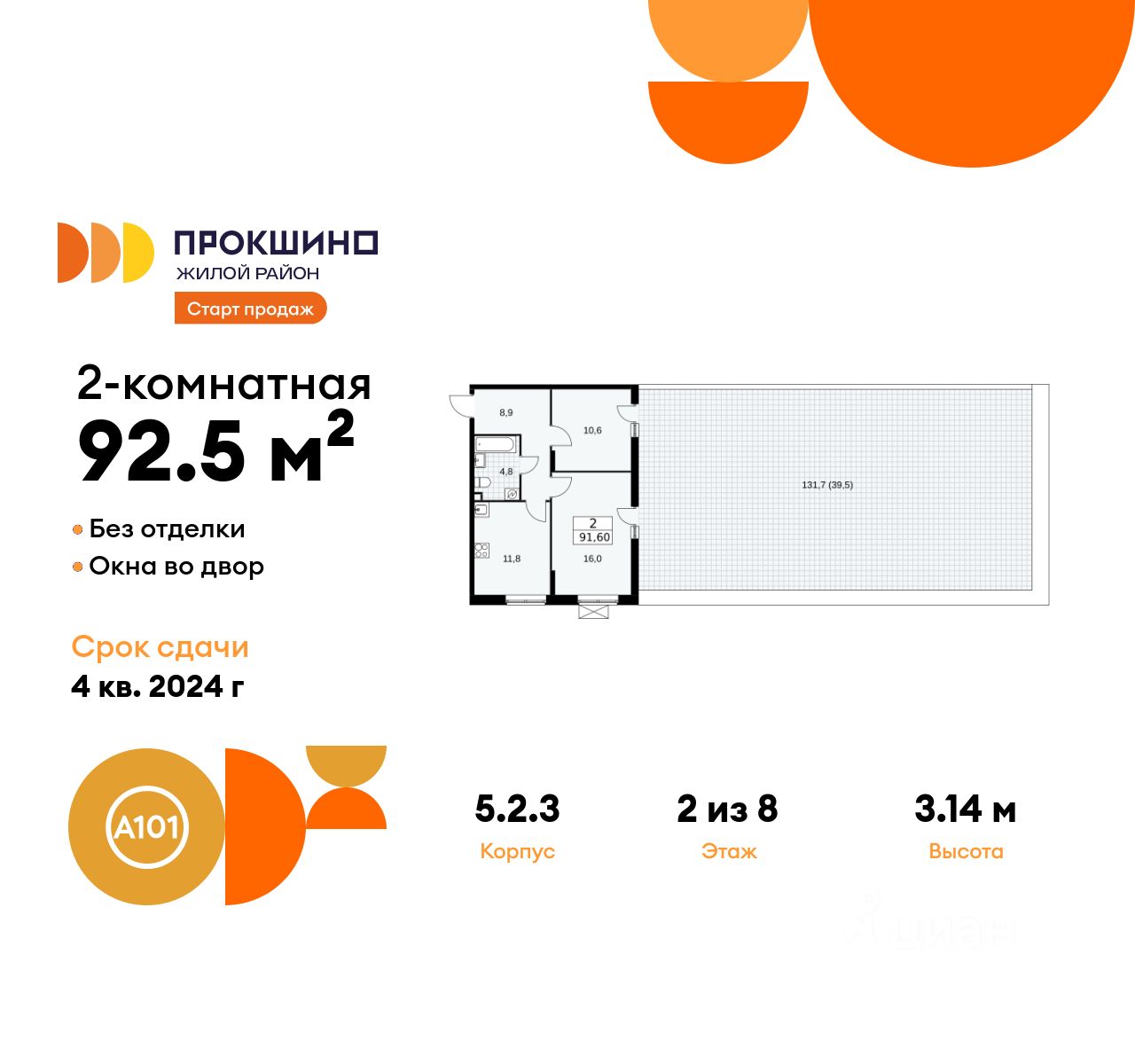 Продается двухкомнатная квартира 518 в новостройке Жилой квартал "Прокшино" по адресу Москва, ТиНАО, Новомосковский АО, Сосенское С/П, жилой комплекс Прокшино, 5.2.3, район Коммунарка, Новомосковский административный округ, Москва. Общая площадь квартиры - 92.50 кв. м., этаж 2 из 8, секция 5. Тип проекта, по которому построен дом - монолит, компания-застройщик - ООО "А101". Стоимость квартиры - 26392100 Р.