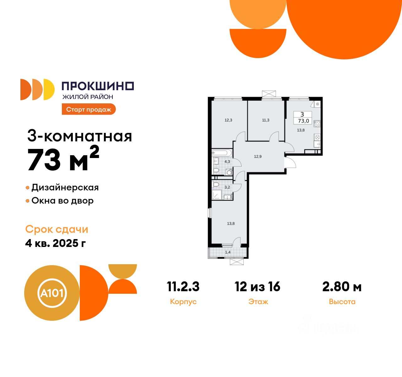 Продается трехкомнатная квартира 475 в новостройке Жилой квартал "Прокшино" по адресу Москва, ТиНАО, Новомосковский АО, Сосенское С/П, жилой комплекс Прокшино, к11.2.3, район Коммунарка, Новомосковский административный округ, Москва. Общая площадь квартиры - 73.00 кв. м., этаж 12 из 16, секция 6. Тип проекта, по которому построен дом - монолит, компания-застройщик - ООО "А101". Стоимость квартиры - 26576380 Р. Срок сдачи - 4 квартал 2025.
