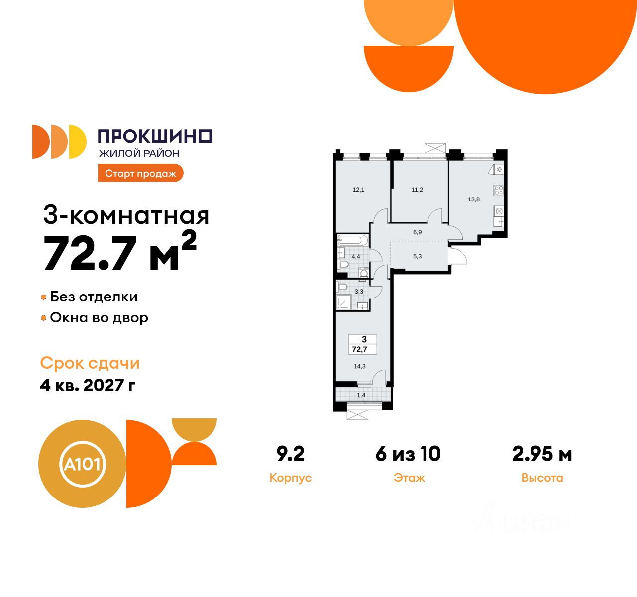 Продается трехкомнатная квартира 269 в новостройке Жилой квартал "Прокшино" по адресу Москва, ТиНАО, Новомосковский АО, Сосенское С/П, пос. Коммунарка. Общая площадь квартиры - 72.70 кв. м., этаж 6 из 10, секция 6. Тип проекта, по которому построен дом - монолит, компания-застройщик - ООО "А101". Стоимость квартиры - 26036778 Р. Срок сдачи - 4 квартал 2027.