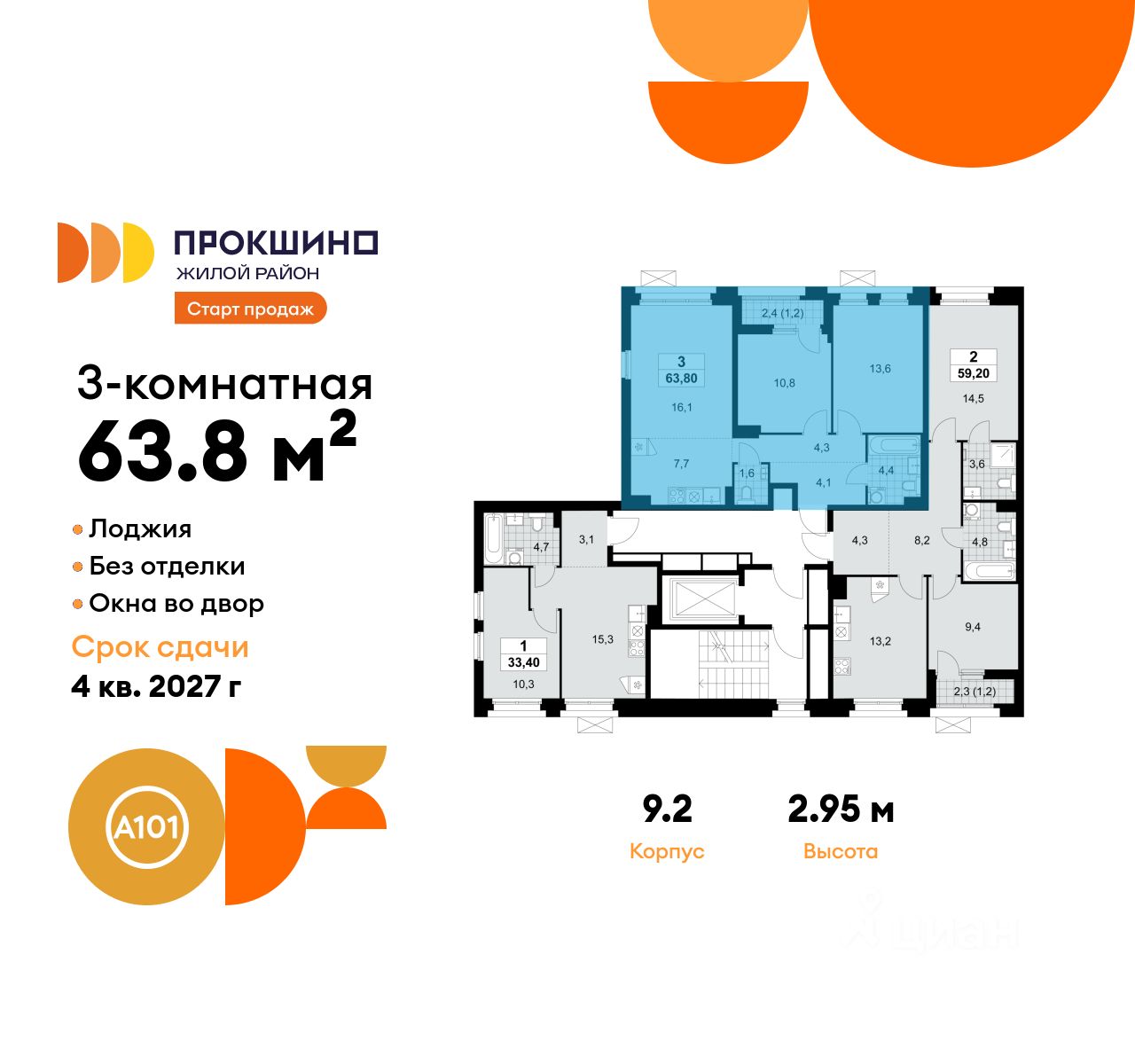 Продается трехкомнатная квартира 130 в новостройке Жилой квартал "Прокшино" по адресу Москва, ТиНАО, Новомосковский АО, Сосенское С/П, пос. Коммунарка. Общая площадь квартиры - 63.80 кв. м., этаж 8 из 10, секция 3. Тип проекта, по которому построен дом - монолит, компания-застройщик - ООО "А101". Стоимость квартиры - 23323366 Р. Срок сдачи - 4 квартал 2027.