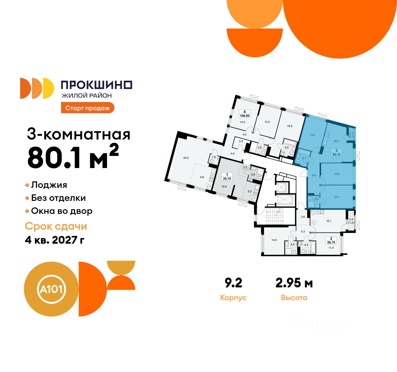 Продается трехкомнатная квартира 195 в новостройке Жилой квартал "Прокшино" по адресу Москва, ТиНАО, Новомосковский АО, Сосенское С/П, пос. Коммунарка. Общая площадь квартиры - 80.10 кв. м., этаж 14 из 14, секция 4. Тип проекта, по которому построен дом - монолит, компания-застройщик - ООО "А101". Стоимость квартиры - 29647413 Р. Срок сдачи - 4 квартал 2027.