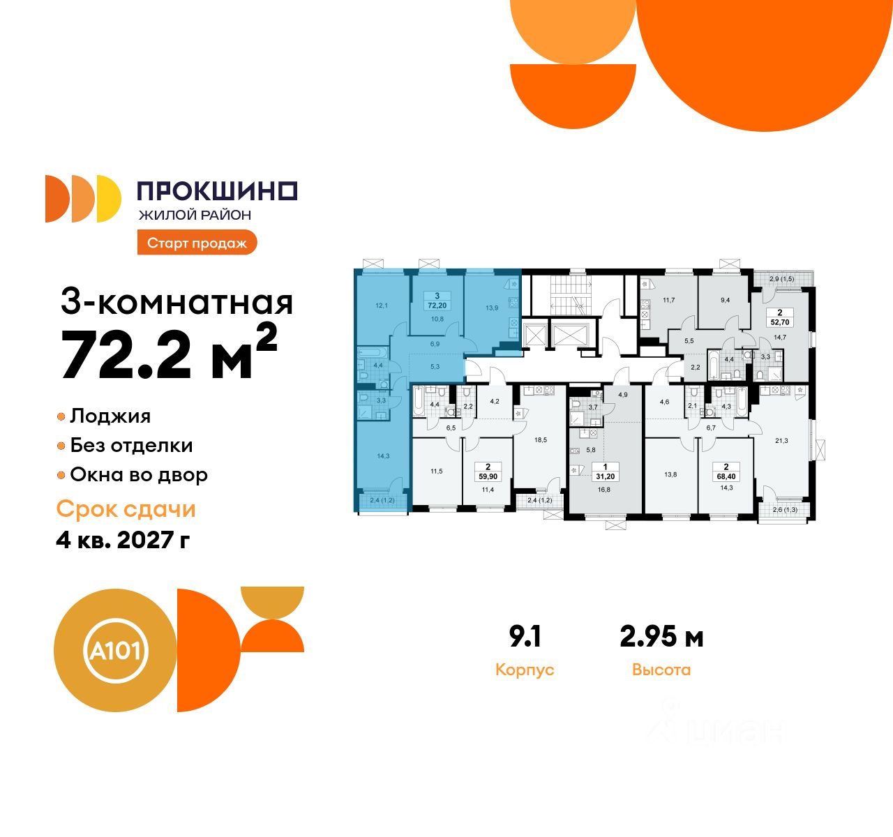 Продается трехкомнатная квартира 50 в новостройке Жилой квартал "Прокшино" по адресу Москва, ТиНАО, Новомосковский АО, Сосенское С/П, пос. Коммунарка. Общая площадь квартиры - 72.20 кв. м., этаж 12 из 13, секция 1. Тип проекта, по которому построен дом - монолит, компания-застройщик - ООО "А101". Стоимость квартиры - 26834574 Р. Срок сдачи - 4 квартал 2027.