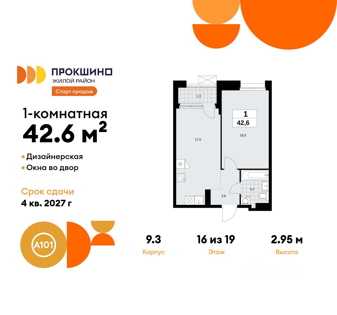 Продается однокомнатная квартира 415 в новостройке Жилой квартал "Прокшино" по адресу Москва, ТиНАО, Новомосковский АО, Сосенское С/П, пос. Коммунарка. Общая площадь квартиры - 42.60 кв. м., этаж 16 из 19, секция 7. Тип проекта, по которому построен дом - монолит, компания-застройщик - ООО "А101". Стоимость квартиры - 18318000 Р. Срок сдачи - 4 квартал 2027.