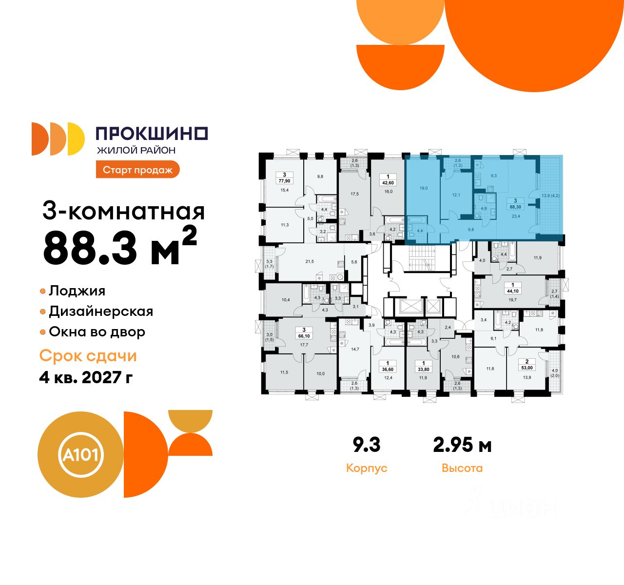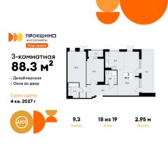 Продается трехкомнатная квартира 434 в новостройке Жилой квартал "Прокшино" по адресу Москва, ТиНАО, Новомосковский АО, Сосенское С/П, Москва, Новомосковский административный округ, район Коммунарка, жилой комплекс Прокшино. Общая площадь квартиры - 88.30 кв. м., этаж 18 из 19, секция 7. Тип проекта, по которому построен дом - монолит, компания-застройщик - ООО "А101". Стоимость квартиры - 33222169 Р. Срок сдачи - 4 квартал 2027.
