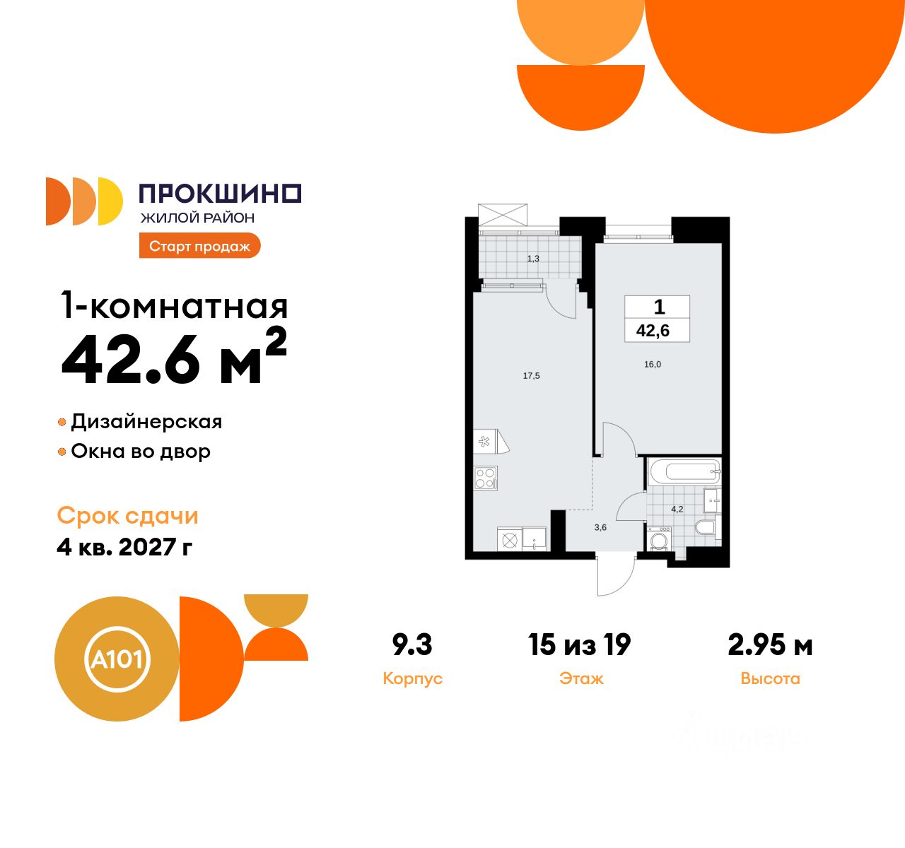 Продается однокомнатная квартира 406 в новостройке Жилой квартал "Прокшино" по адресу Москва, ТиНАО, Новомосковский АО, Сосенское С/П, пос. Коммунарка. Общая площадь квартиры - 42.60 кв. м., этаж 15 из 19, секция 7. Тип проекта, по которому построен дом - монолит, компания-застройщик - ООО "А101". Стоимость квартиры - 18242598 Р. Срок сдачи - 4 квартал 2027.