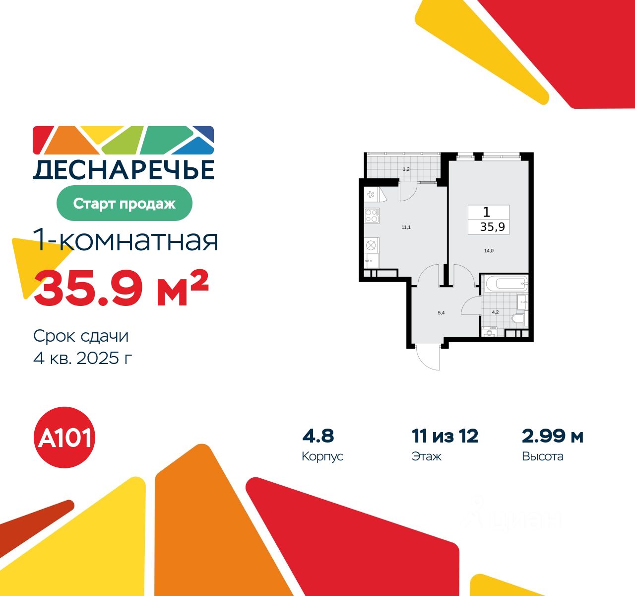 Продается однокомнатная квартира 2005 в новостройке ЖК "Деснаречье" по адресу Москва, ТиНАО, Новомосковский АО, Десеновское С/П, Десна деревня, Москва, район Троицк, ЖК Деснаречье, к. 4.8. Общая площадь квартиры - 35.90 кв. м., этаж 11 из 12, секция 26. Тип проекта, по которому построен дом - монолит, компания-застройщик - ООО "А101". Стоимость квартиры - 13675028 Р. Срок сдачи - 4 квартал 2025.