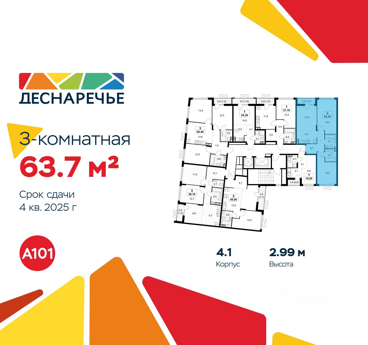 Продается трехкомнатная квартира 167 в новостройке ЖК "Деснаречье" по адресу Москва, ТиНАО, Новомосковский АО, Десеновское С/П, Десна деревня, Москва, район Троицк, ЖК Деснаречье, к. 4.1. Общая площадь квартиры - 63.70 кв. м., этаж 13 из 15, секция 2. Тип проекта, по которому построен дом - монолит, компания-застройщик - ООО "А101". Стоимость квартиры - 21654178 Р. Срок сдачи - 4 квартал 2025.
